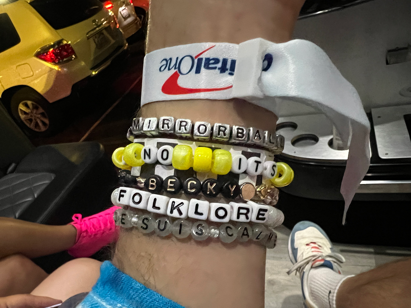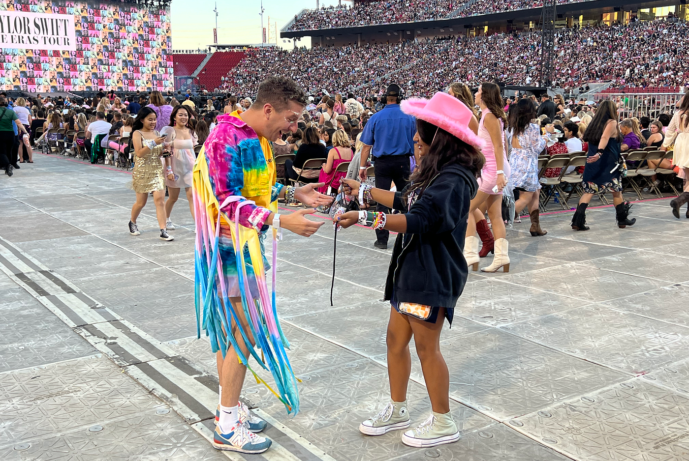 Two different Swifties gave me “no its becky” friendship bracelets, one of whom spotted me from far away and charged up the stadium steps to reach me before I disappeared in the crowd.