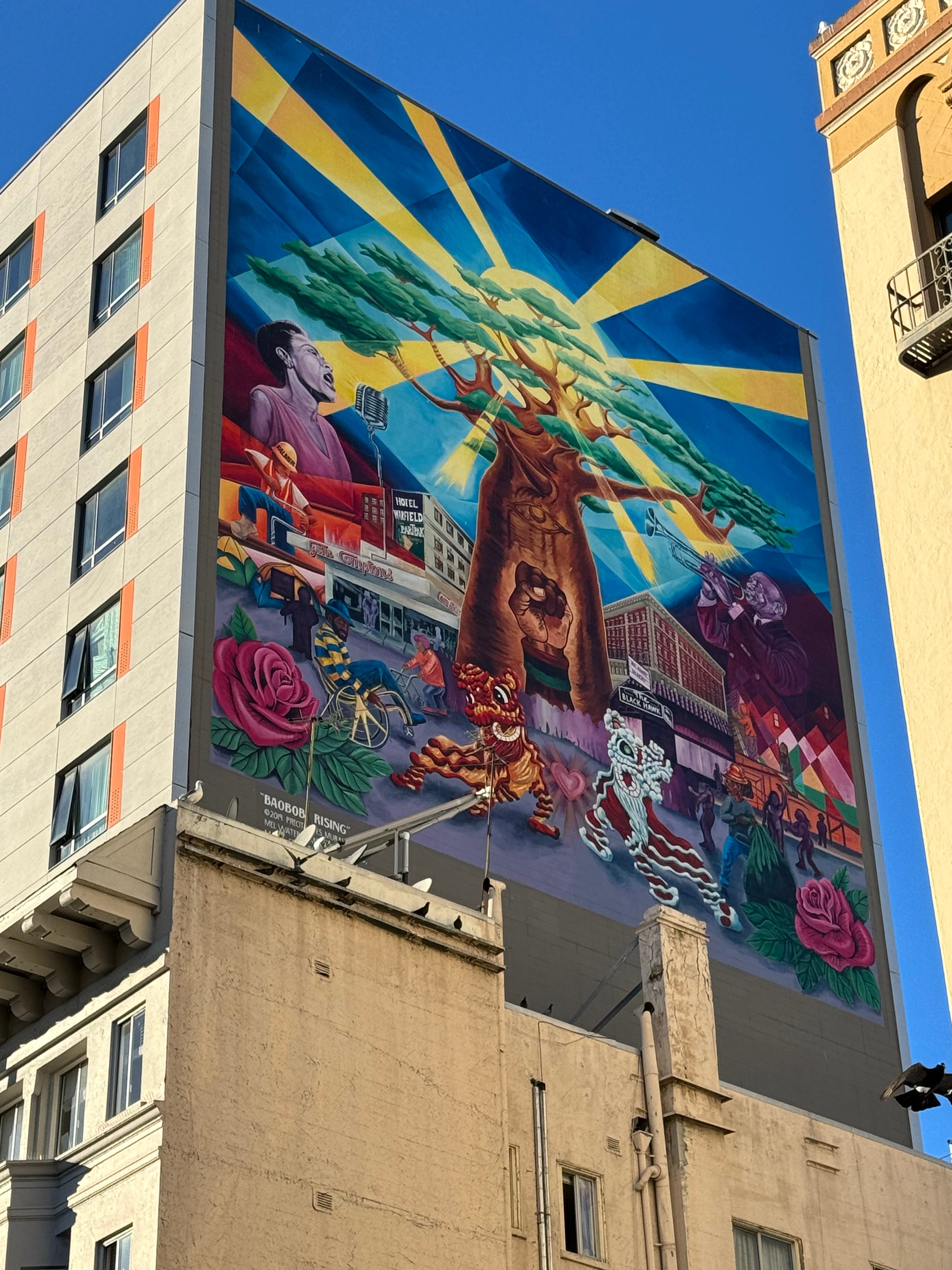 But it’s not all past glories on the side of the PG&E building. More recent neighborhood developments, like the outdoor mini-park art space cheekily called the Tenderloin National Forest, as well as the new exclave of Vietnamese diaspora known as Little Saigon, also get shout-outs.