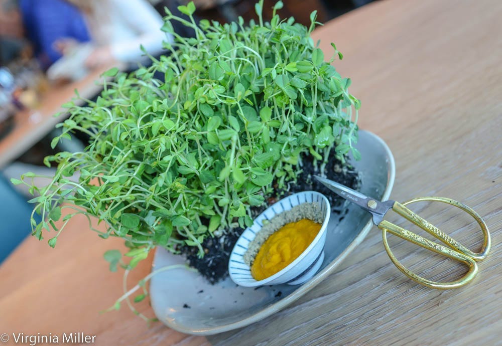 Happily, I saw three creative salads on the menu, which California always does better than anywhere in the world (oh, the sad salads I’ve had at some thousands of restaurants globally). I ordered a Triple T Ranch and Farm pea shoot salad, which our kind server described as “interactive.” He wasn’t kidding. It arrived as a full-on garden of pea shoots springing up from a dirt base with fancy shears to cut the shoots. We dipped the crisp, uber-fresh shoots in a lively, whipped carrot dressing laced with sunflower crumble. We laughed at the childlike, elemental feel of cutting and eating “grass” tableside. It all gets a bit messy, but the staff cleaned the table as they gathered up our remaining clippings.