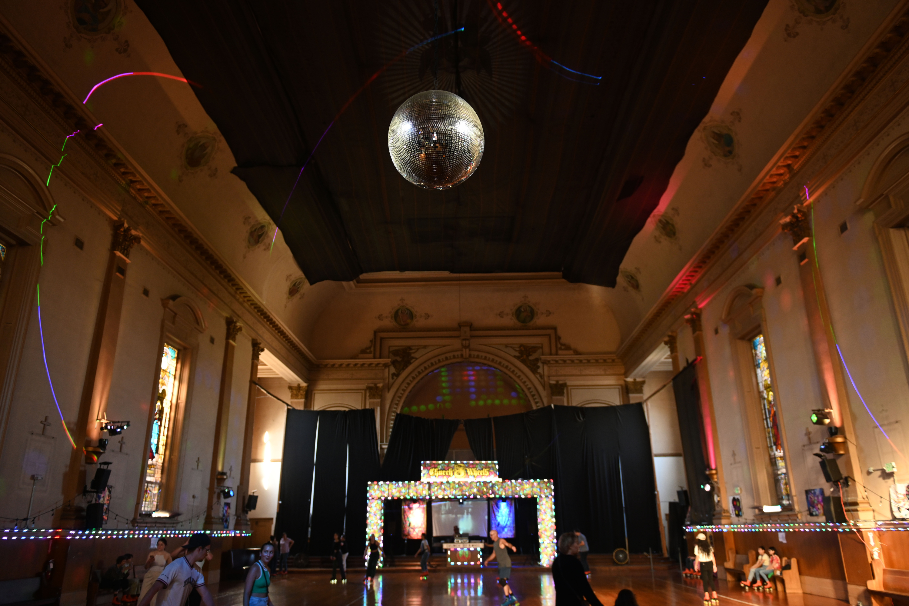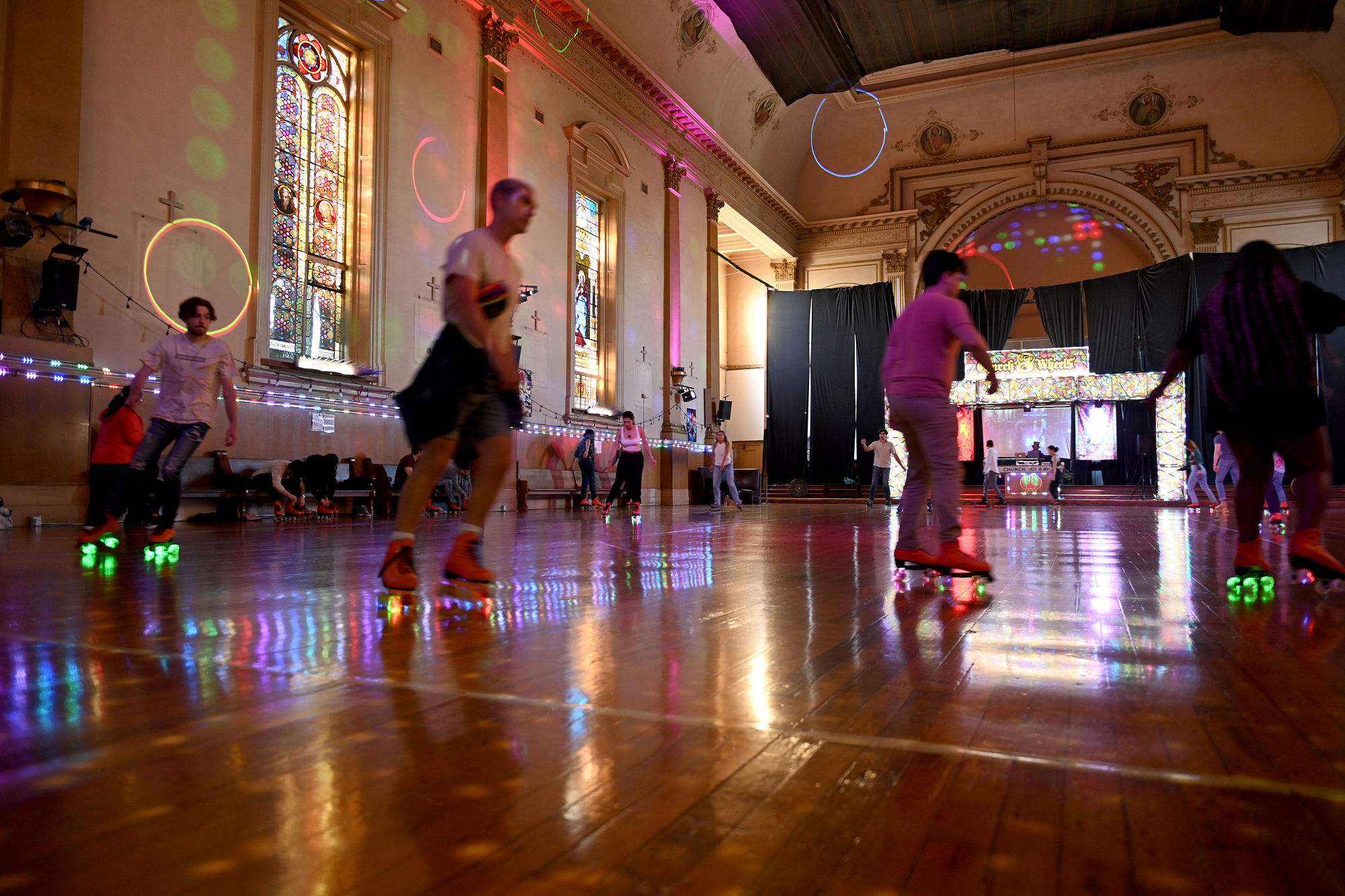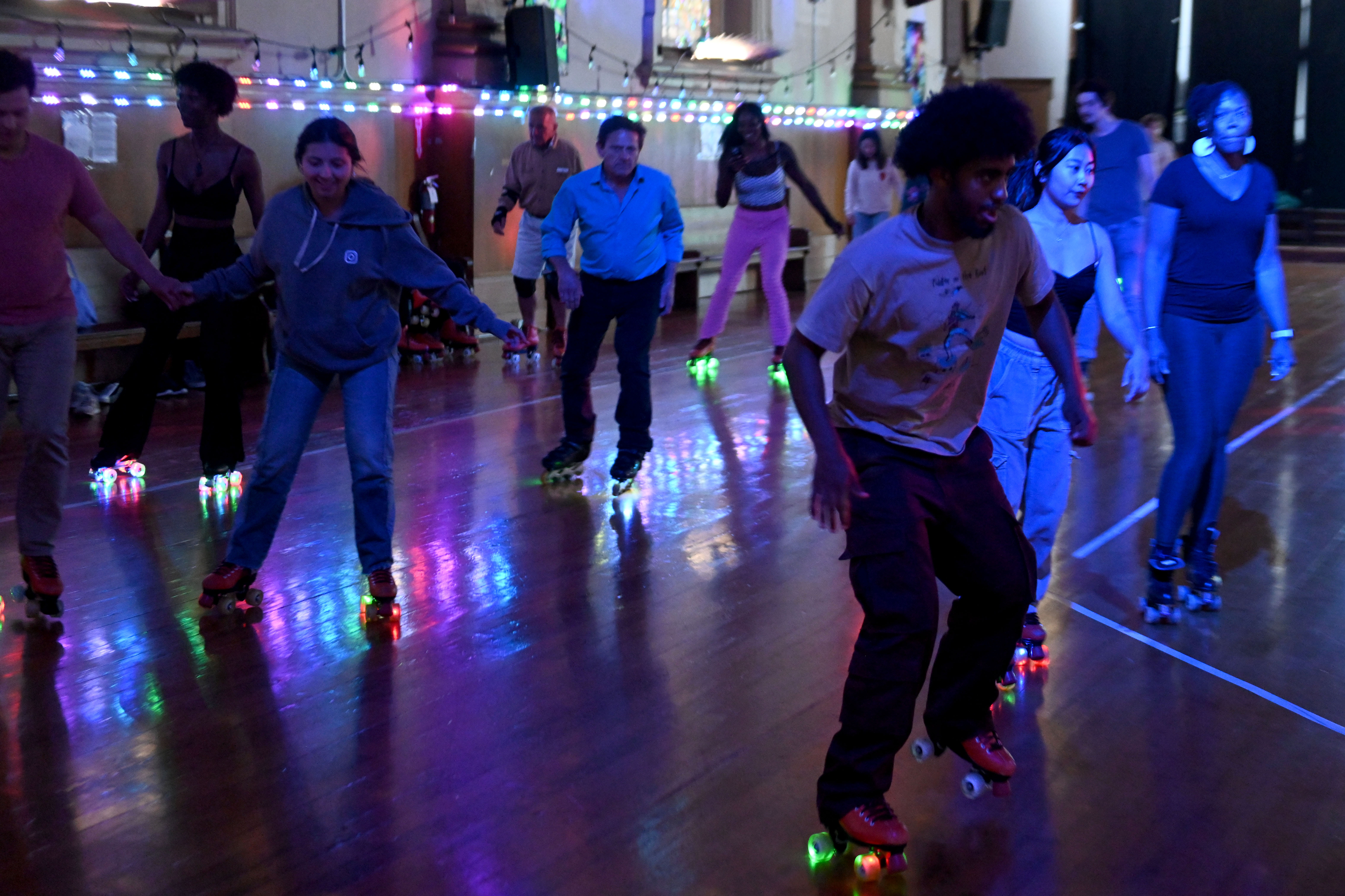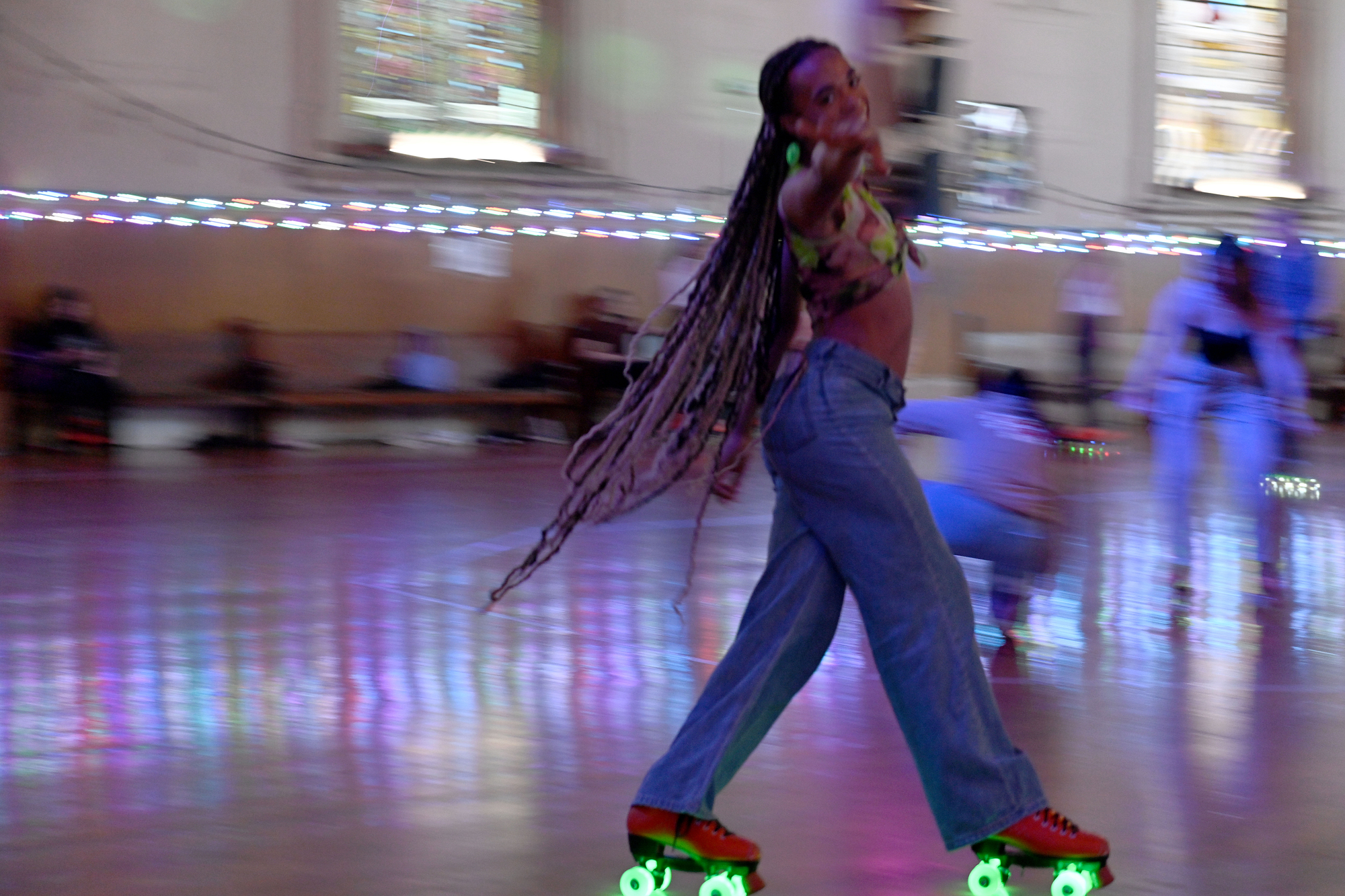 Patterned lights grace the old walls and ceiling and elastic-seeming shapes run along stained glass windows. A fairly packed house, people fly along the floor, peeling and stepping their eight wheels along the laminated surface. Everyone can hear funk booming from speakers as their skates light up green, red and blue.