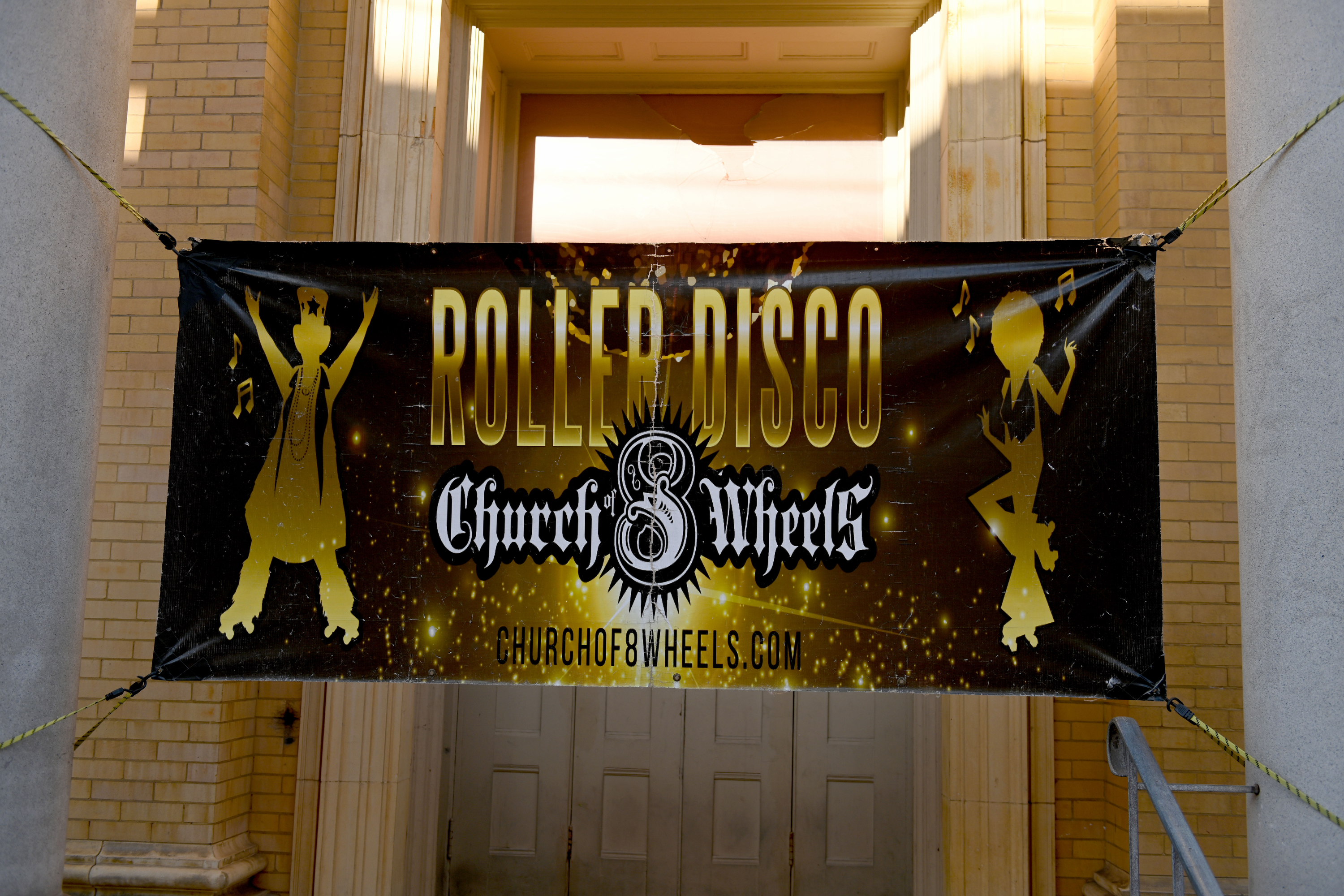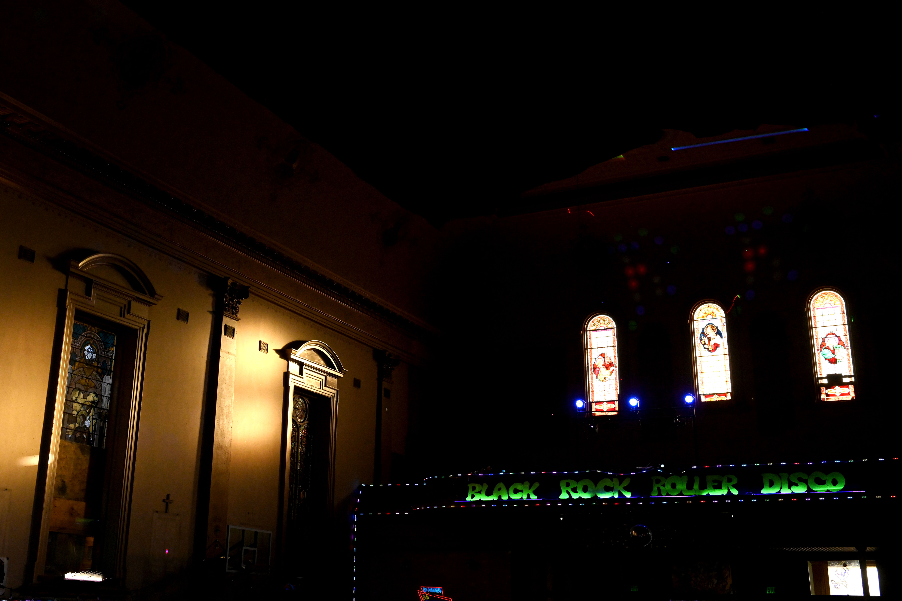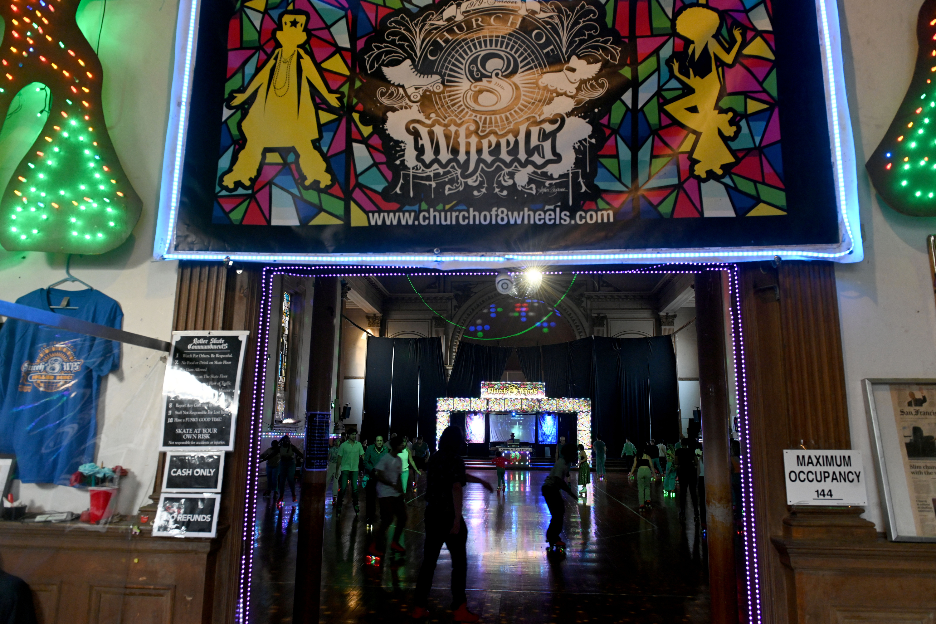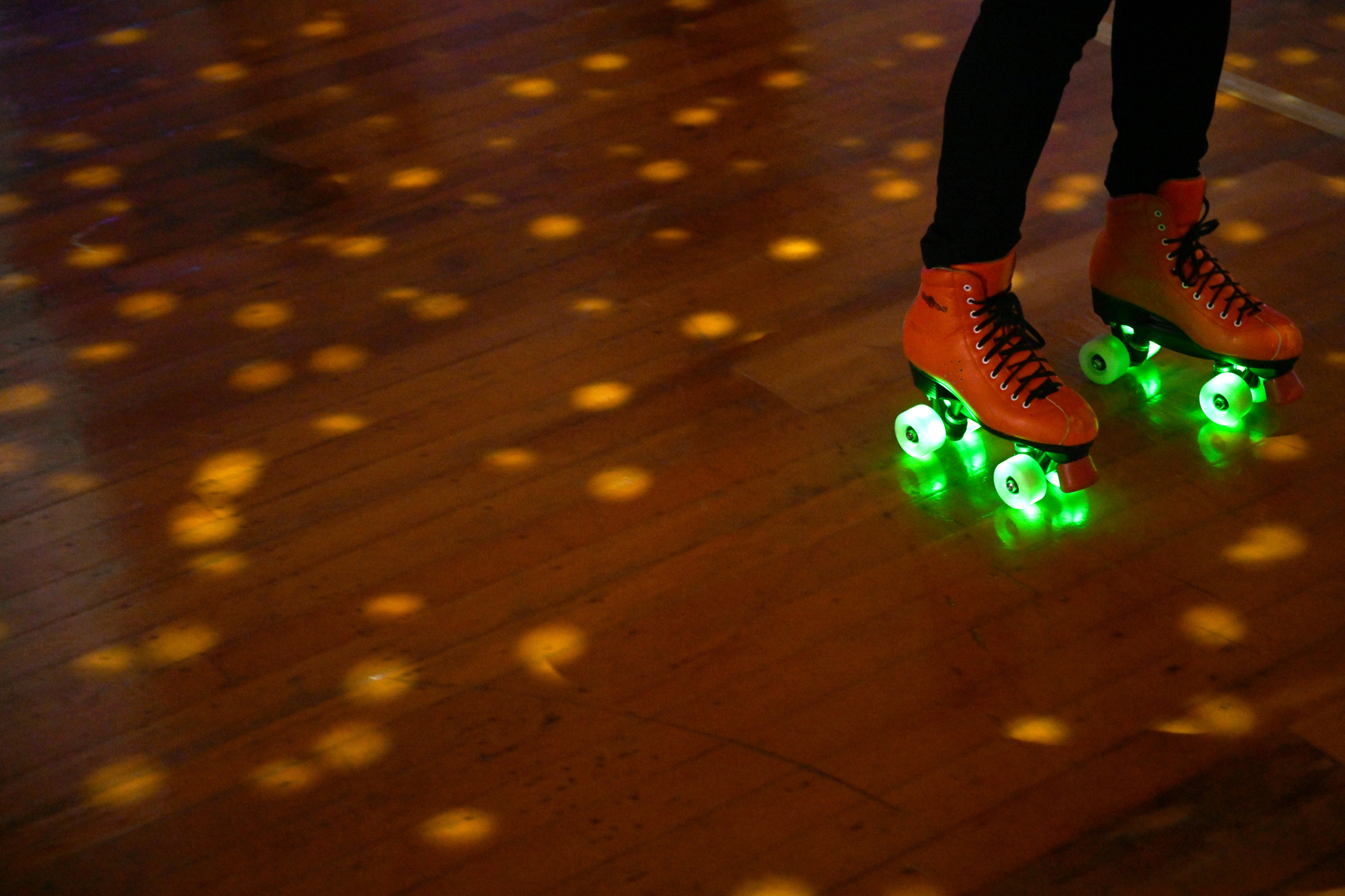 Patterned lights grace the old walls and ceiling and elastic-seeming shapes run along stained glass windows. A fairly packed house, people fly along the floor, peeling and stepping their eight wheels along the laminated surface. Everyone can hear funk booming from speakers as their skates light up green, red and blue.