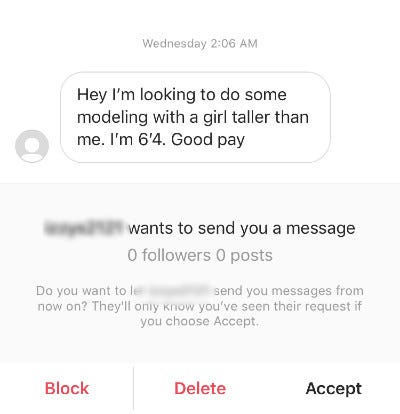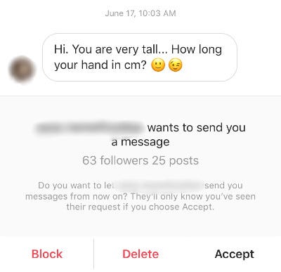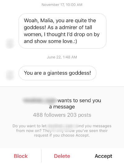 Before you view the following snapshots, I want to say that I am in no way shaming people for their fetishes. Here’s a glimpse into the inbox of a tall woman on Instagram.