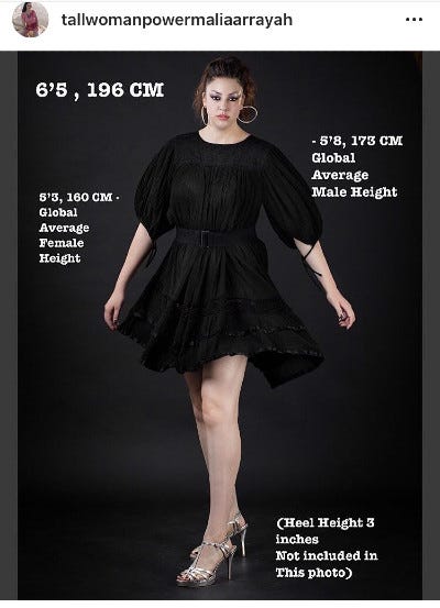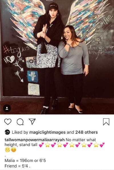 I wanted to find the positivity in this strange world. I wanted to be like the Ashley Graham of the plus-size movement, but for extremely tall women. So off into the world of Instagram I went with my new profile, @tallwomanpowermaliaarrayah.