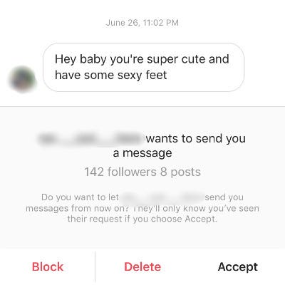 Then the money offers started coming in. I sifted through my DMs and noticed that there were people offering me cash for photos of my feet and measurements of my legs.