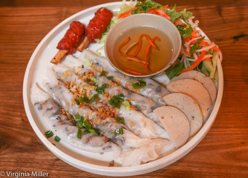 I want to return for other for-the-table items, much as I hate large dishes limiting my option to try more. I especially want to try whole fish dishes. I’m tempted by fried catfish ($95) with “wrap & roll” rice paper, veggies and herbs, pickled cucumber and nuoc cham pineapple sauce. But at half the price, a whole, fried red snapper marinated in lemongrass sauce, topped with lemongrass chili jalapeños, sounds equally appealing. Dammit, there’s also a third: turmeric dill chả cá, a beloved Hanoi grilled fish dish, loaded with onion and dill.