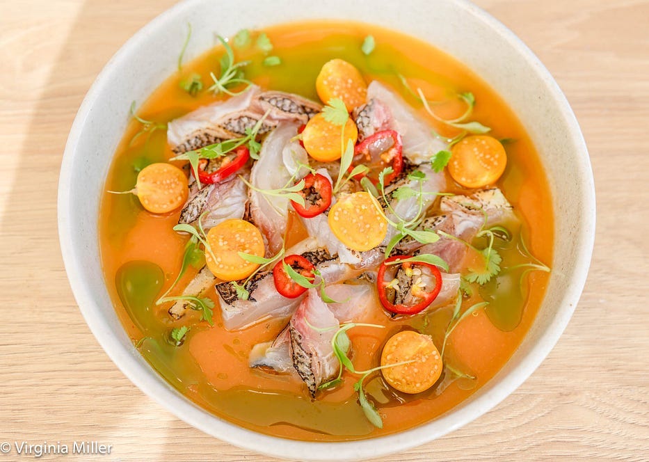 Clean yet lively seafood starters wow. Kothai ceviche is cured sweet red shrimp with the purity of raw shrimp in the best sushi, enlivened with garlic, shallots, dill and mint, cradled in little gem lettuces. It’s unmissable. Likewise, a silky dry-aged seabream crudo pops with gooseberries, Fresno chilies and charred fennel in a citrus mango coulis. Both dishes exemplify breeziness without compromise in the flavor department.