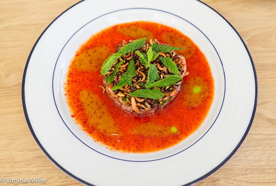 Likewise light, an arugula salad shows off ripe, juicy Korean chamoe melon — which I’d happily eat as dessert — tossed with prosciutto, almonds, kumquats and cotija in a simple white balsamic vinaigrette. Crying Tiger tartare is a delicate mound of velvety prime ribeye tataki in shallots, cilantro and Thai chilies, with puffed black for crunch. It’s another delicate and flavor-packed dish.