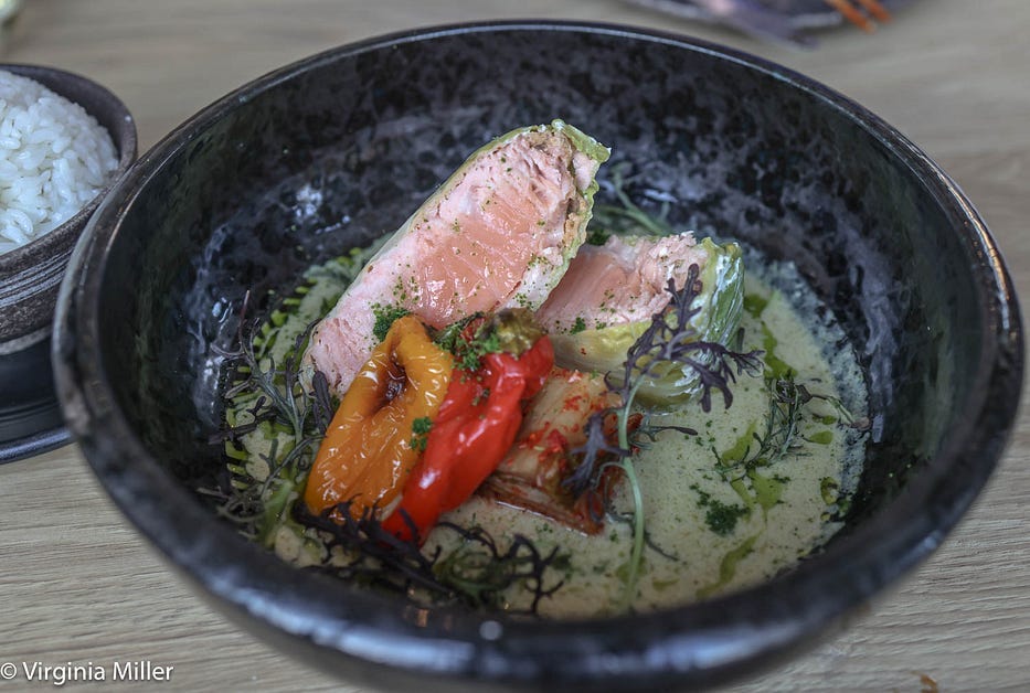 Larger plates are no slouch. For example, red curry Cornish hen stuffed with aromatic raisin and toasted almond sticky rice, accompanied by broccolini in a red curry soubise, tastes like the holidays. Medium-rare King salmon haw mok is a gluten-free twist on a classic steamed curry dish common around Thailand, Laos and Cambodia. Korea plays in the dish with accompanying baek kimchi (white kimchi) swimming in green curry emulsion, contrasted by sweet peppers, makrut lime and bamboo shoots, steamed and cooked until they impart a nice funk.