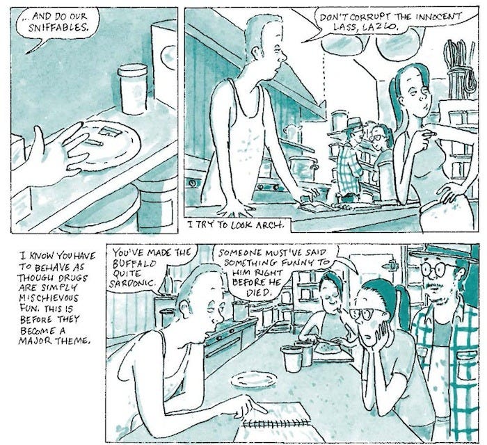 I bought the book on the description alone — it’s a graphic novel exploring the seedy world of sex, drugs, and cafe characters in ’70s Oakland — and read Over Easy in a day. It’s a tough book to put town. Pond immediately makes you a fan of Margaret, a kid full of self doubt and sardonic humor, whose mentor is the Imperial’s manager, a man who somehow has time for doing coke, raising kids, and spreading mass gossip about his employees’ incestuous relationships.