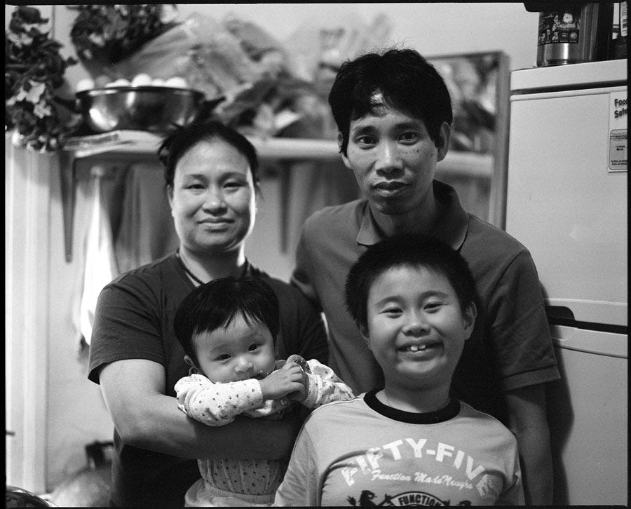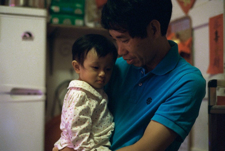 Jun is 44 but looks a decade younger. He’s thin and sinewy, with the tranquil fatigue that only fathers of very young children have. For the hour or so that we’re there, he never stops cradling his infant daughter, cooing to her, bouncing her on his knee, blowing her wisps of dark hair. There is a palpable feeling of tenderness and warmth. A breeze wafts through the window, stirring the clothespinned shirts and carrying the smell of onions and the sound of voices talking momentously in Chinese.