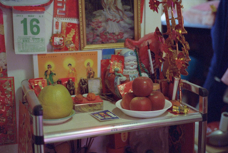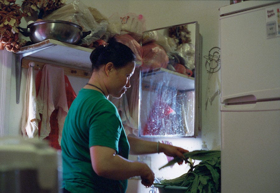 The walls are dingy and the ceilings singed-looking. When we enter Jun Tan’s apartment, I think at first that we’re in a little girl’s bedroom. There’s a small bed canopied by pink curtains and shelves glittery with porcelain. I count at least six calendars on the wall, the oldest dating 2011. But this can’t be a child’s room because here, at the foot of the bed, is a refrigerator and a wok, a rice cooker, sheaves of bok choy. There’s a sink beneath a speckled mirror. And there, quiet and stolid, not meeting her own reflection, is Jun Tan’s wife preparing dinner.