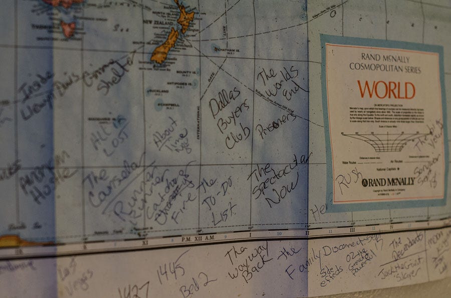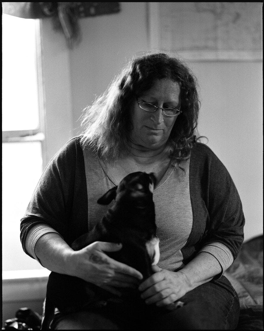 Her room here is small and comfortably lived in. On warm days she props open the door and hangs a beaded curtain that lets fresh air through. There’s no bathroom or kitchen. A microwave and a $20 hotplate from Goodwill take care of most meals. A blanket printed with Van Gogh’s Starry Night, salvaged from Golden Gate Park, is tacked to the ceiling. On the wall beside the bed is a map of the world on which she jots the names of movies to rent from the library. The hotel shows movies on a flat-screen TV in the lobby, but Cynthia rarely ventures down since what’s playing is usually horror. Her tastes run more toward Nora Roberts romances, a paperback copy of which lies on her bed. This is what’s so charming about Cynthia: She’s gentle and unassuming, with a nervousness that she disguises by fussing with her dog, Maggie. “She barks when she hears people on the fire escape,” Cynthia says, gesturing to the window. “I put a screen up because I worried about people poking their heads in at night.”