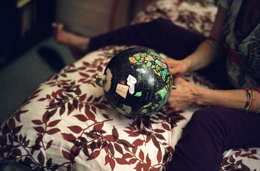 Ronni pulls a globe from her shelf and explains how she’s been instructed to divide the world. First, she turned the earth upside down on its axis. Next she used a knife to scrape off countries deemed offensive. Then she used a sharpie to bisect the United States along the length of the Mississippi, declaring everything east of the line Tornado Alley and therefore expendable. “I feel the burden of centuries,” she tells me with something like noble sadness in her eyes.