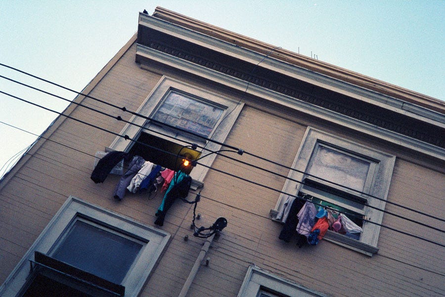 Nothing indicates that this wood-framed, three-story building is a residential hotel. It sits halfway down a dead-end alley in Chinatown, tucked away from the bustle of Grant Avenue. Laundry flutters in every other window. Inside everything is raw wood, the color of matchsticks.