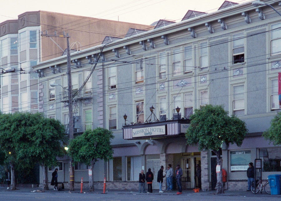 He neglects to mention an even worse option: prison, where he served 13 months for drug possession. San Francisco was a different city then, he tells me. All along Mission and Valencia, edgy young men leaned against buildings or parked cars, smoking crack and flashing gang signs. There was a murder almost every night in the SROs. People were stabbed. The paddy wagon was more or less permanently double-parked in the neighborhood.