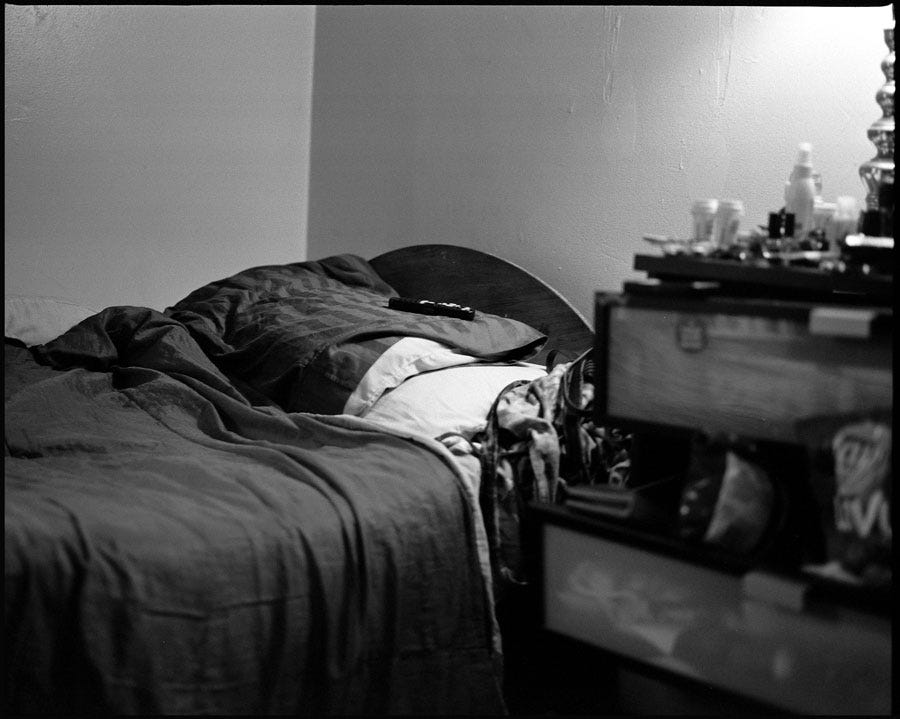 The building, like the Mission Hotel, has an institutional severity only partially relieved by a rooftop deck. “It might look like a condo but don’t let that fool you — it’s an SRO,” Clarence says. He has lived here for a month and a half and hasn’t done much by way of decorating. The walls are bare. The only furniture is a bed, a chest of drawers, and a stand on which sits a junk TV. He recently bought a rug that matches the floor, but it’s still rolled up and now serves as a place to hang his coat.