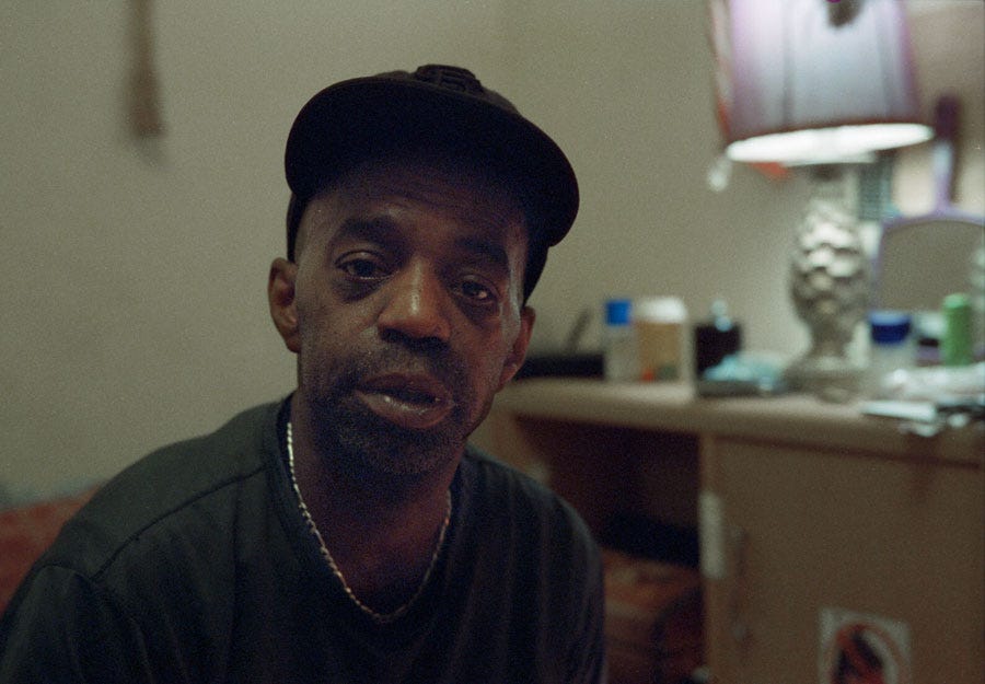 “I’ve lived here nine years and I ain’t going nowhere,” Calvin tells me. His room is a little square crowded with shapes that gradually resolve into identifiable things: a wooden backscratcher over the bed, a printout from his mother’s funeral, a potbellied jar about one-fourth full of change, a prescription pill bottle holding a handful of M&M’s. A tree outside the open window rustles like money. “If I had a choice between the street and here, I’d pick here. If I had a choice between here and a mansion, I’d pick the mansion,” Calvin says.