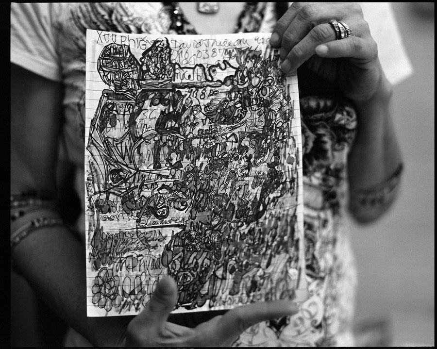 She takes dictation from various sources: ghosts, phantoms, family members, and ancient gods who counsel her about Mu, the land of the dead. “Look here, can you see the faces?” she says, holding a tiny mirror — the kind used to cut cocaine — slantwise against a page of cramped calligraphy. I can’t see anything except the snarled beauty of her penmanship.