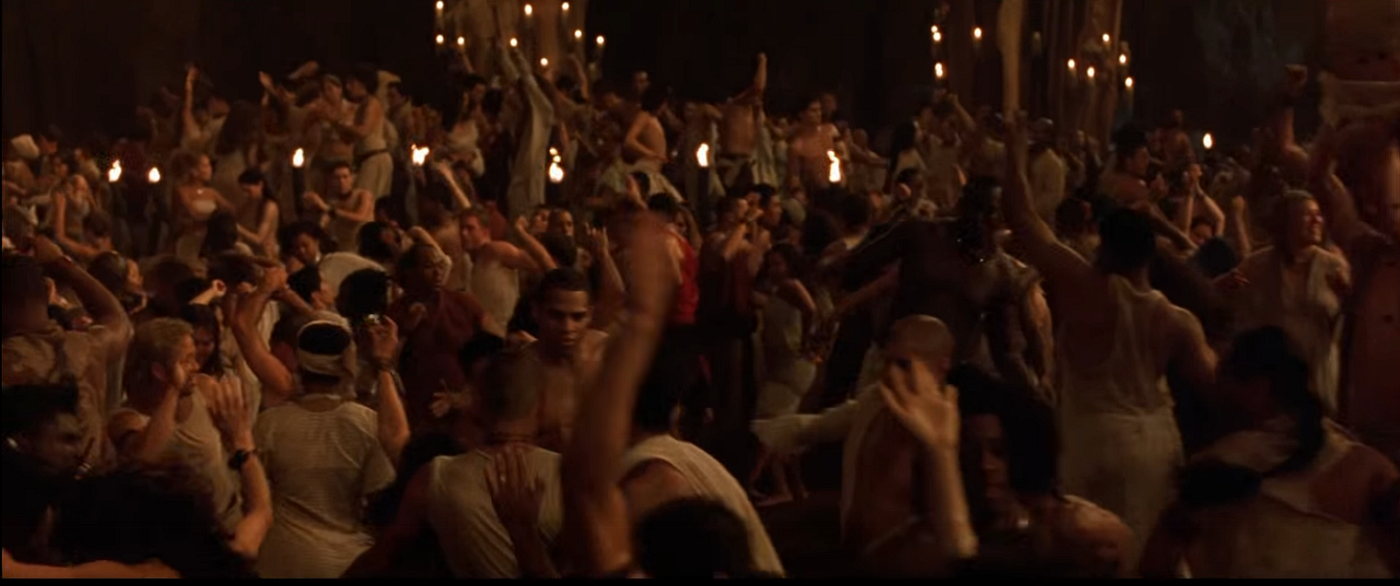 The big dancing-around-on-speed rave / awkward orgy scene was also shot in a disused air hanger on the island.