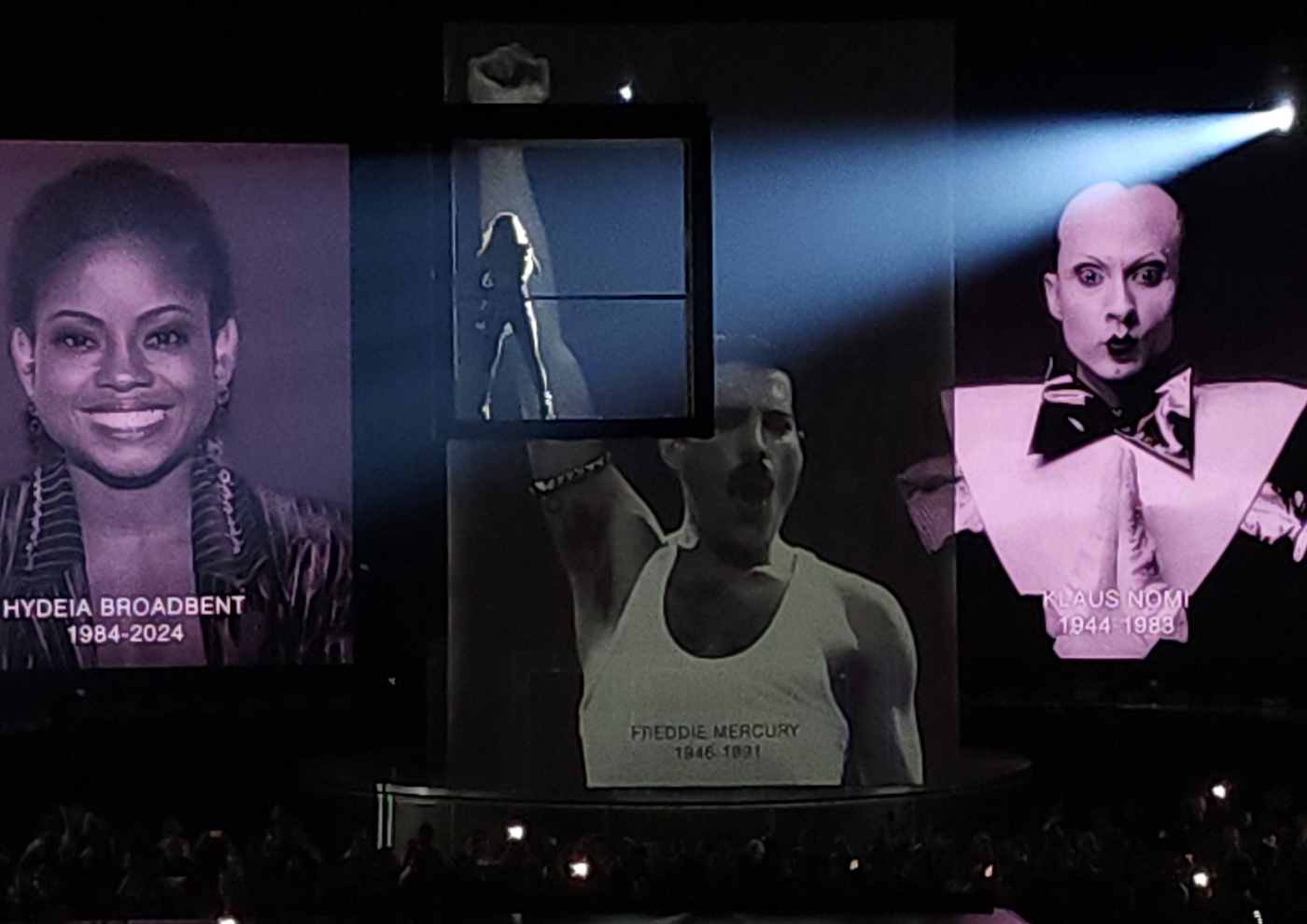 Screens showed archival photos of icons while Madonna looked onward: Hydeia Broadbent, Freddie Mercury, Klaus Nomi, and Keith Haring appeared among other portraits. Eventually, the photos filled our vision inside Chase Center.