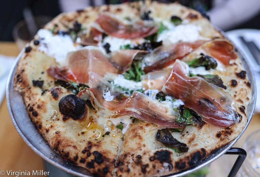 A pea tendril stracciatella pizza laden with green garlic, pecorino and fior di latte cheeses, Meyer lemon and speck, evokes Germanic Italian/Northern Italy cuisine. Housemade rigatoncini pasta in pork and beef Bolognese sauce is prime example of the all-ages comfort Fiorella does so well. Finish with a childhood-worthy creamsicle gelato made with cara cara navel oranges, whimsically coated in cocoa nibs and a house chocolate “magic shell.”