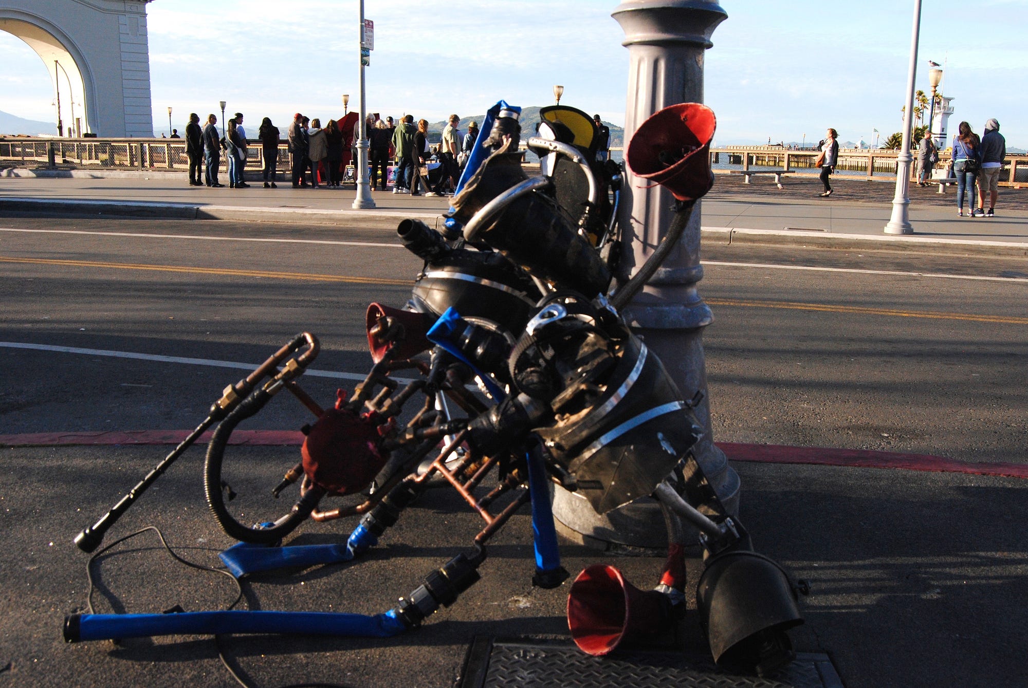 On St. Patrick’s Day, I went to watch Jamus perform at Fisherman’s Wharf in a location the local busking community calls “Spot One.” In an island in the middle of traffic, tourists walk in both directions, pointing at attractions on either side. Some hold ice cream and expensive cameras, while others juggle small children and lofty sightseeing plans. That day, green-clad groups and families paused to listen to Jamus explain his music. He joked, “When I do this, it sounds like a dying cat.” An older woman was moved nearly to tears after his rendition of a classic song improvised with beats. A young girl walked up to the donation box and dropped in a few bills, then ran away in green leggings with braids bouncing after her. The crowds stopped in spite of themselves. They were enchanted, as I was, at the sound of the pipes — once reserved for the green moors of islands and now being played past lines of palm trees, over tour buses and under trolley cars.