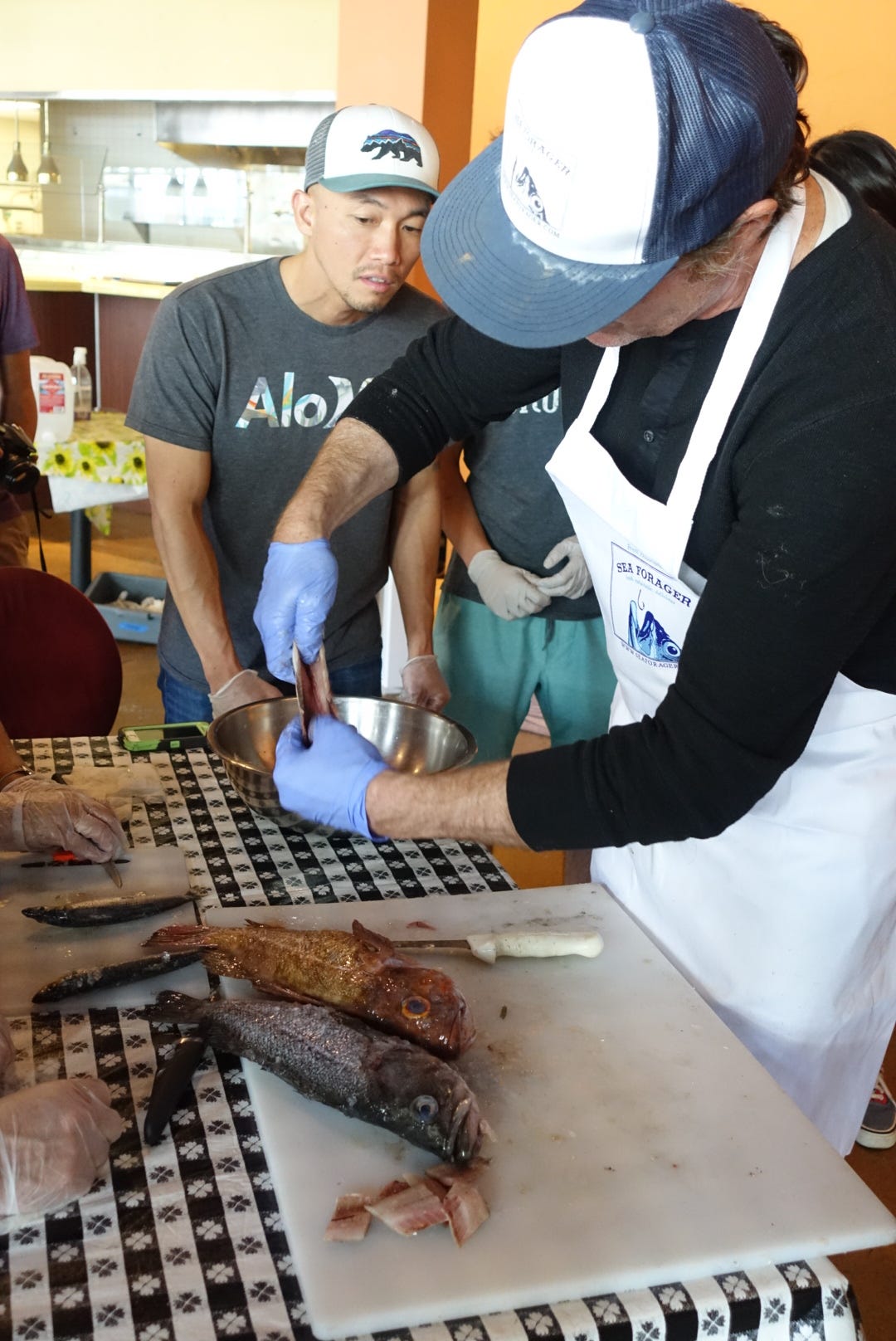 I end up learning more than techniques from the workshop. From the rocky past of the Bay Area herring business to busted seafood myths (e.g., you’re never eating fish caught that day no matter what the menu says), Kirk’s lessons — and wildly gesticulated sea-foraging tales — are what really captivate me. So do the surprises he pulls out of the cooler, including a gray behemoth with a massive row of teeth that’s called a ling cod. “A fisherman once told me he pulled a full-sized murre out of one of these guys’ stomachs!” Kirk exclaims as he wields the giant carcass above his head for us to see.