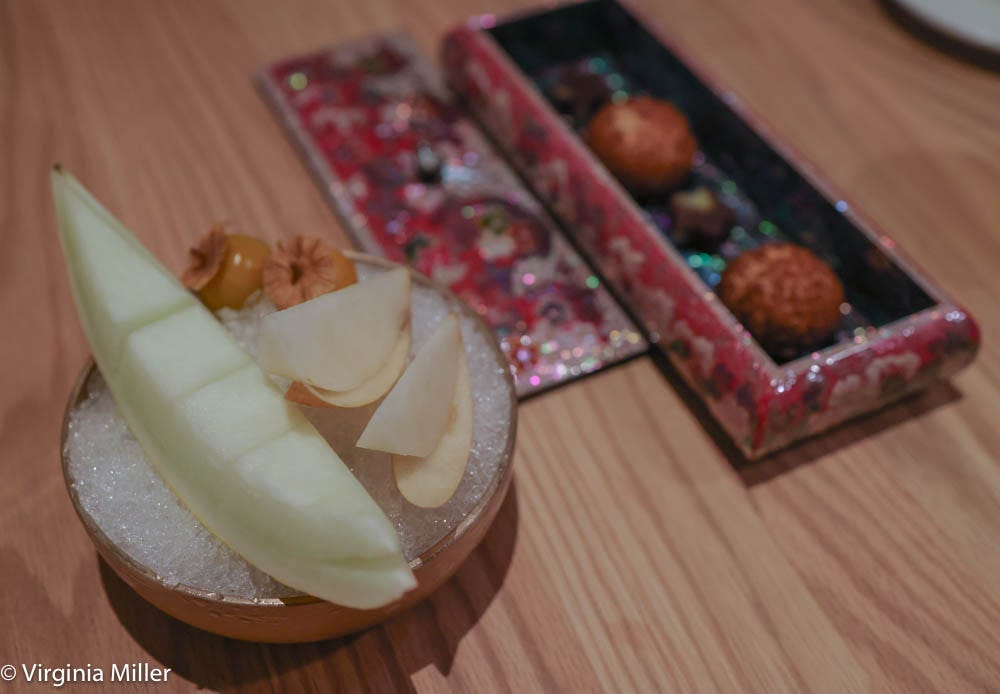 Out of three dessert courses, Brentwood sweet corn ice cream sang of the warmth of our always late-summer October weather, enhanced by black truffles and jocheong crispy Sacramento koshihikari rice and gold cream #3 rice. The dessert is toasty, earthy, sweet, comforting. Clean, juicy bites of perfectly ripe Zuckerman Farms canary melon and shinko pears make a Chez Panisse-worthy finish as you pay the pricy-but-worth-it bill.