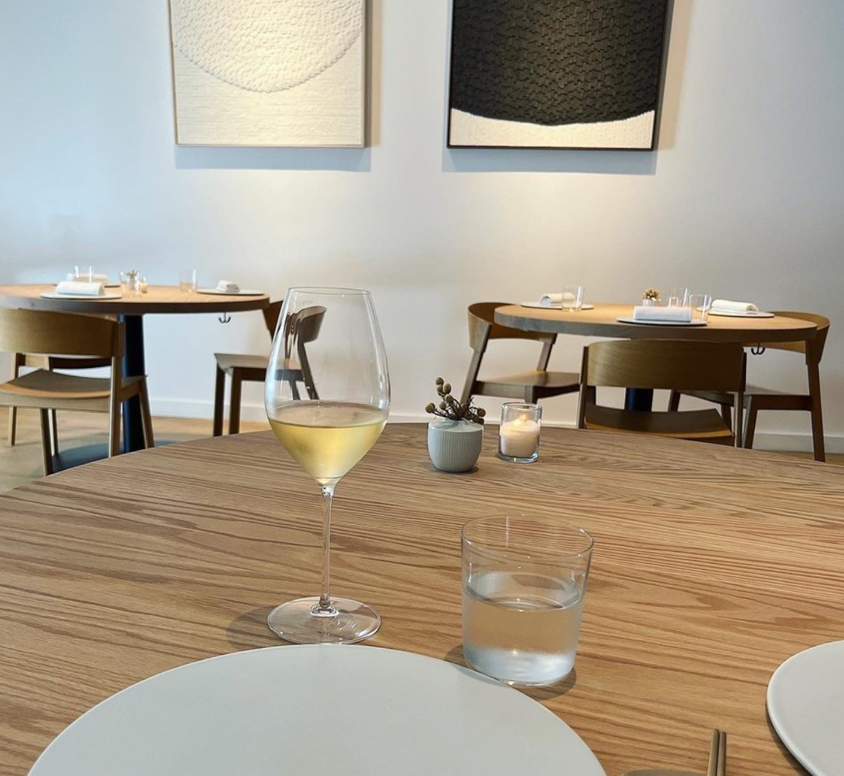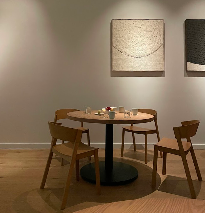 The cozy dining room is more inviting than before, with custom-made accents from Korean craftspeople, minimal flowers and punctuation of color against the dining room’s white glow.