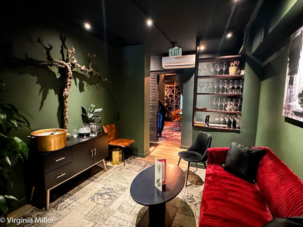 Velvet couches in red, royal blue and soft sky blue, comfy chairs, vinyl selection, mid-century tables, a couple corner booths and a beautifully gnarled Napa vine that Widger saved from being thrown away and is using as wall art, mark the intimate two floors. There’s a private dining room with records, a table and artful, circular wine cellar storage.