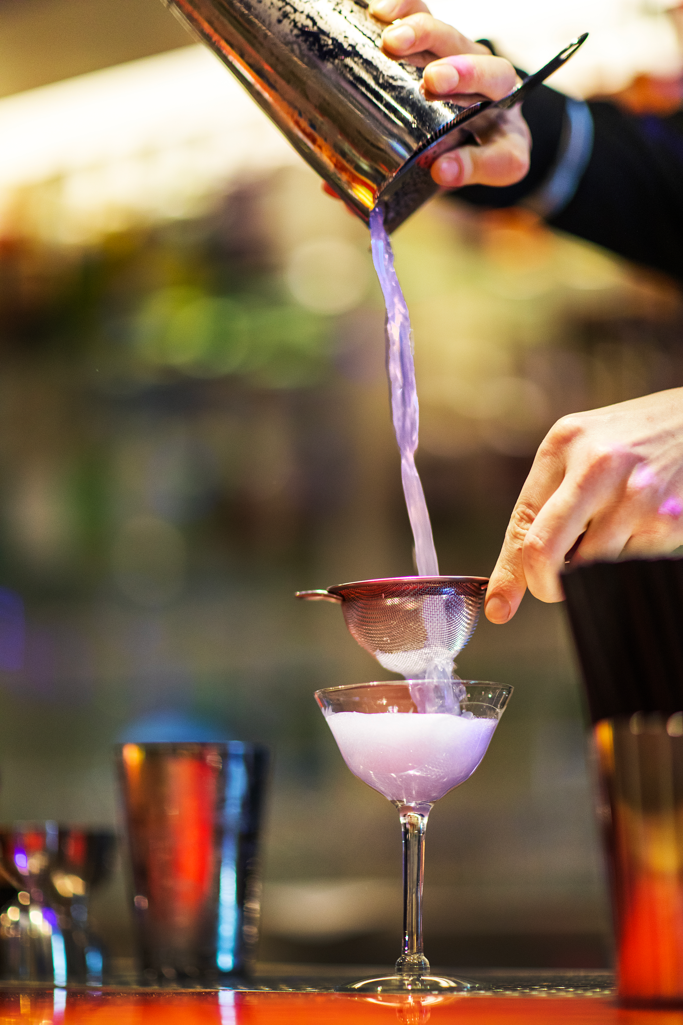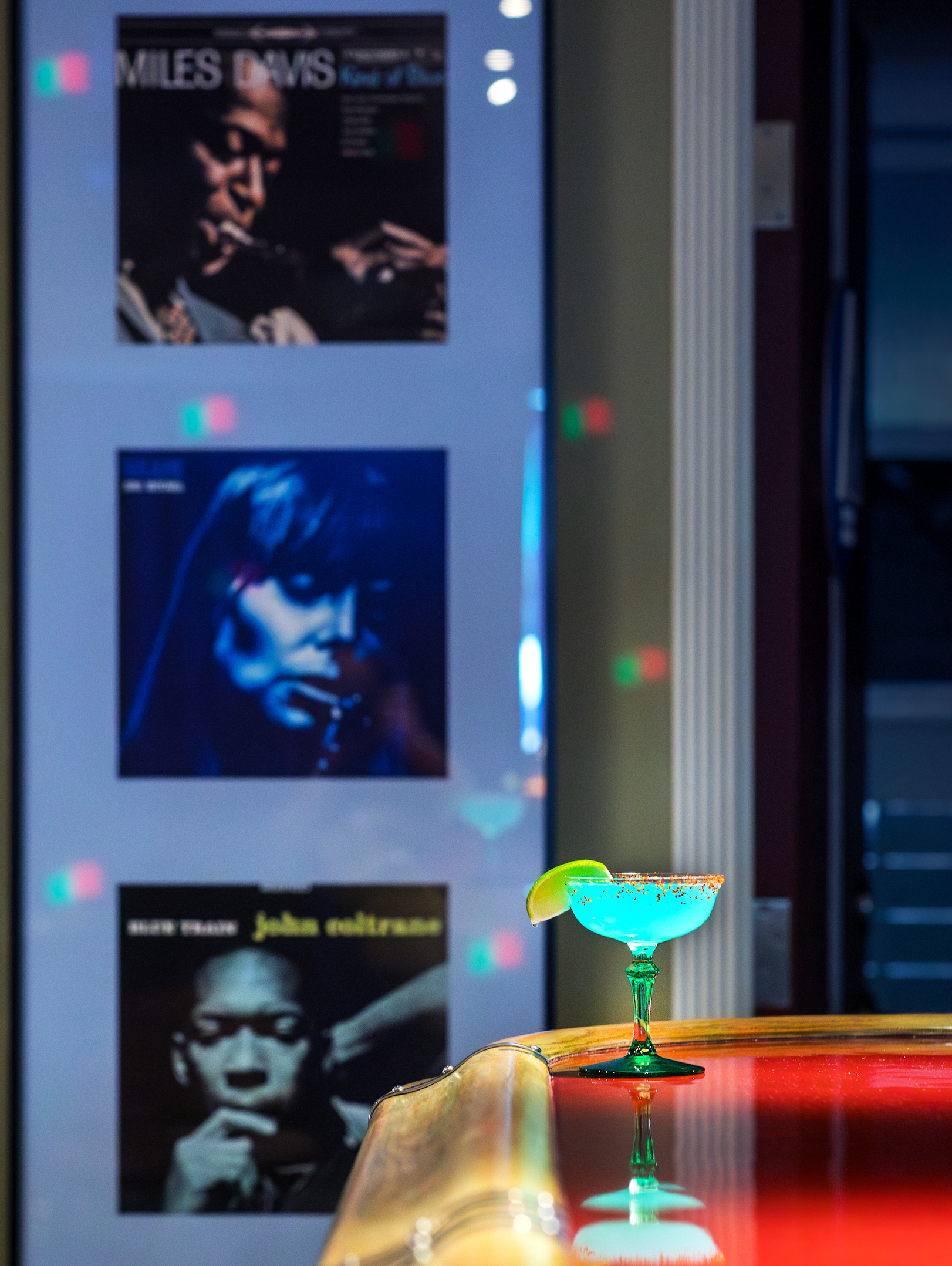 The neighboring Blue Room, which is connected to Stookey’s to the left of its bar, sports a shimmering disco ball, circular yellow and red tables, Fred and Ginger films on the flat screen, and album covers as wide-ranging as Eartha Kitt and Talking Heads side-by-side over the toilet. The bars feel congruent, but Stookey’s commits to the 1930s-40s even in its drinks, while Blue Room ventures a bit further afield. Live music, from jazz to cabaret, centers the Blue Room from its cozy stage by the front window, a beacon to those walking by outside, while cocktails span a few decades.