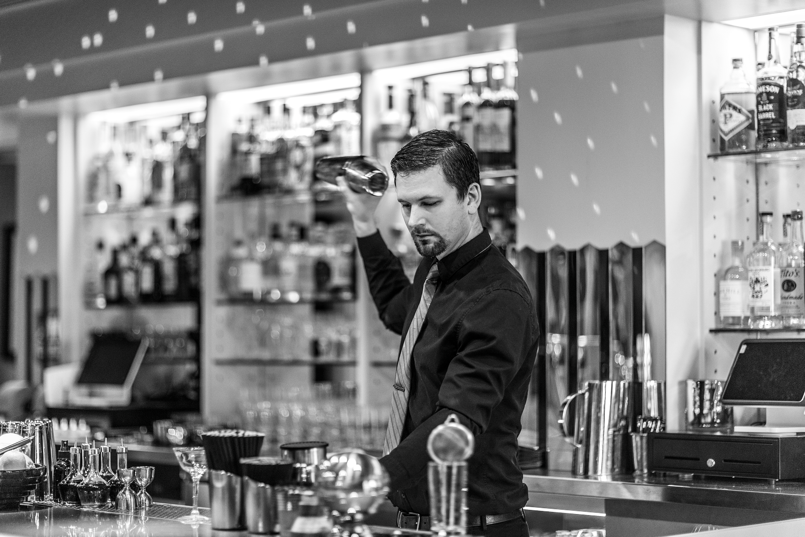 Stookey’s calls out with a glowing neon marquee outside, inside with porthole door windows and white-jacketed, black bow-tied bartenders. Its style is Streamline Moderne, a 1930s evolution of Art Deco with curved, aerodynamic design and even nautical themes. It looks like the kind of bar you’d find on a 1930s cruise ship, walking the deck before pre-dancing in a ballroom with martinis. You can pretend you’re doing just that here.