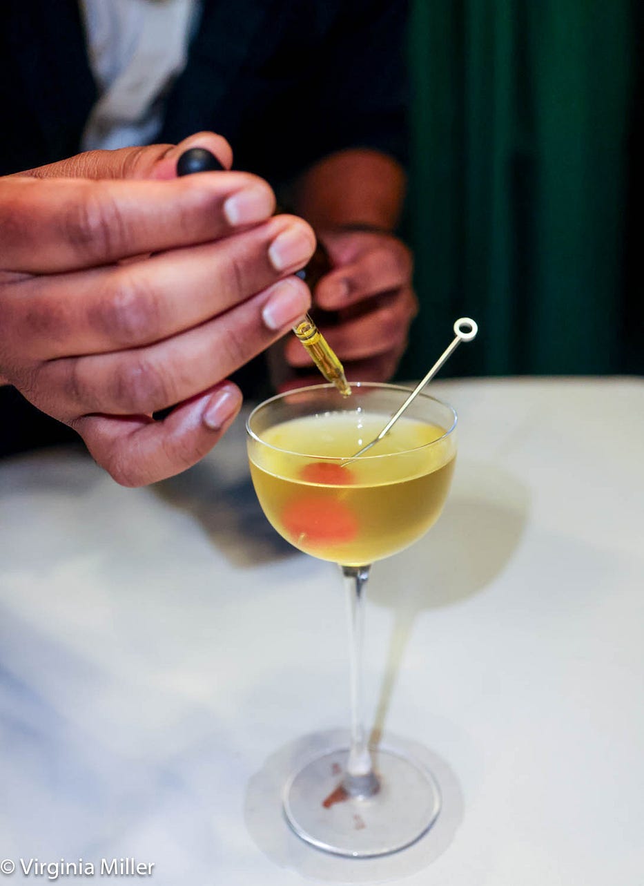 Likewise, the North Beach cocktail is a winning tribute to our beloved Italian neighborhood and its 1970s legend, Golden Boy Pizza. Thomas toasts housemade sourdough bread and infuses it with Parmesan cheese for 48 hours in vodka, then filters it with liquid nitrogen for a fizzy touch. The vodka is mixed with cherry tomato juice, pickled basil, and olive oil for a silky, savory Martini twist.