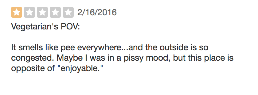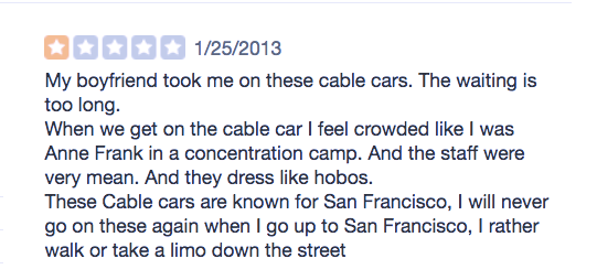 And the award for the most insanely insensitive comments in a Yelp review goes to this reviewer. I hope they (do not) enjoy their limo up the hills of San Francisco.