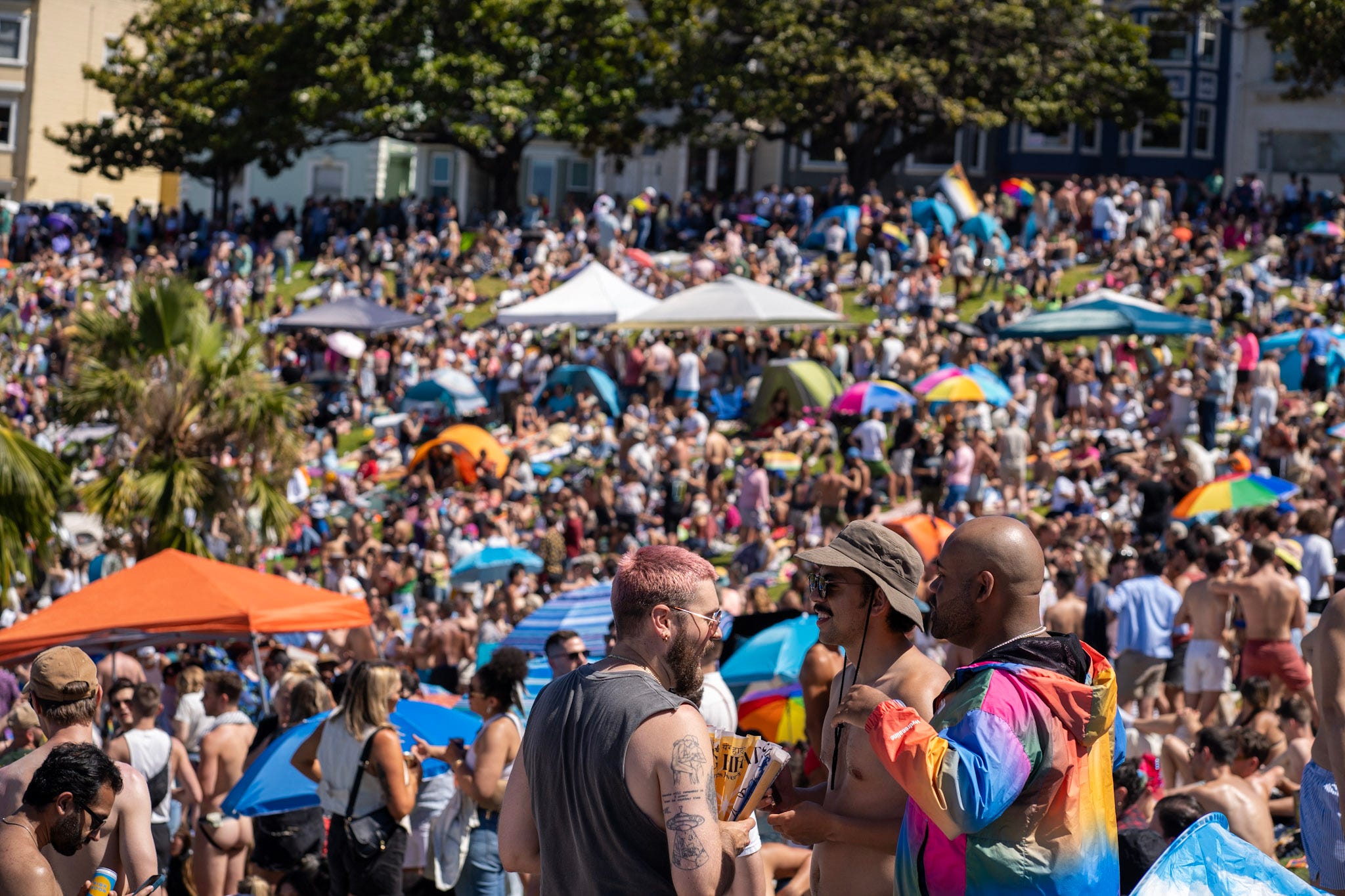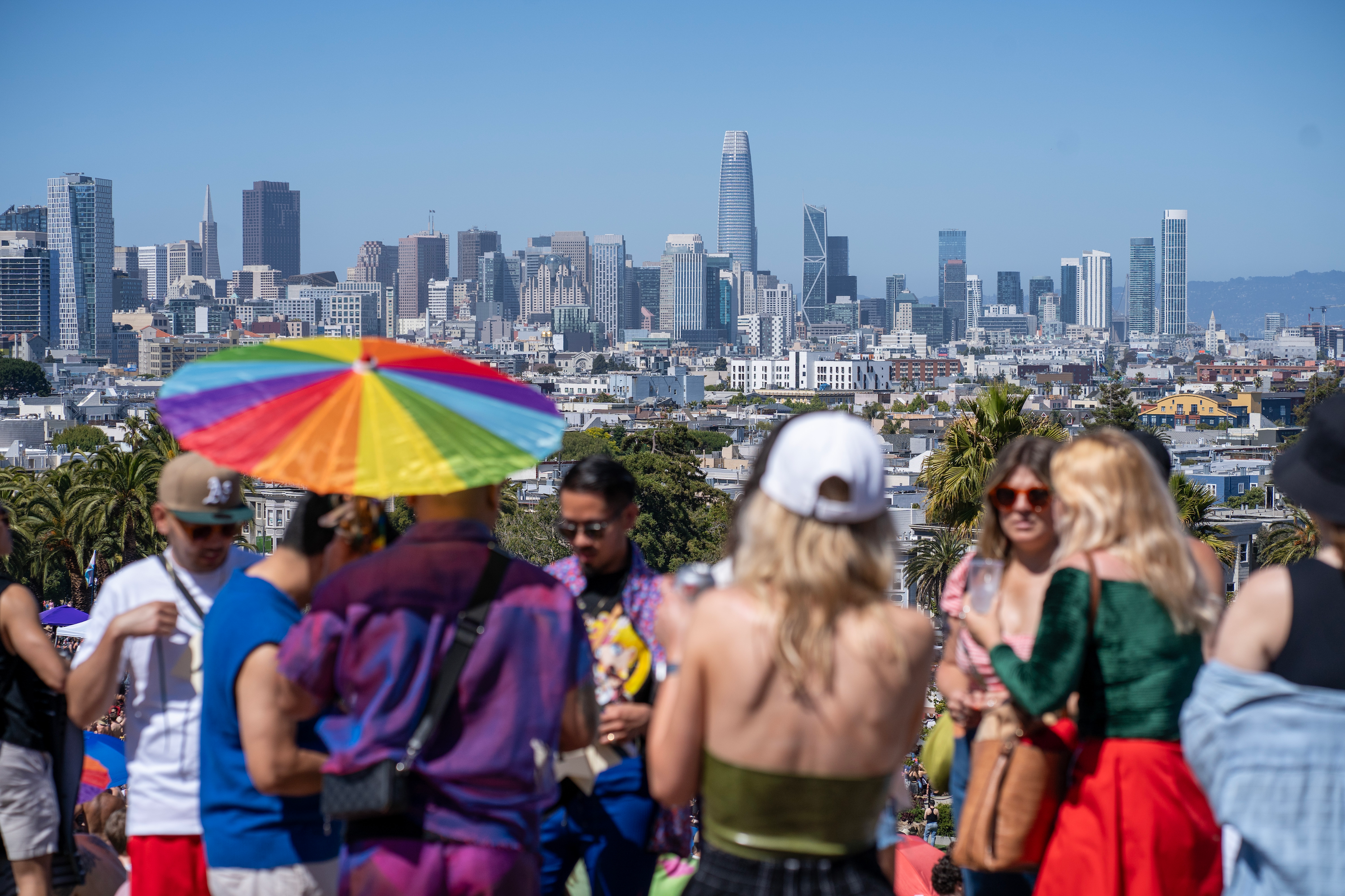 By noon, Dolores Park became a kaleidoscope of color — parasols, flags, and outfits in every imaginable combination, but emphasizing one hue in particular. It was Pink Saturday, our quintessential preamble to the daylong festivities at Pride, the annual celebration and protest for LGBTQ+ rights.