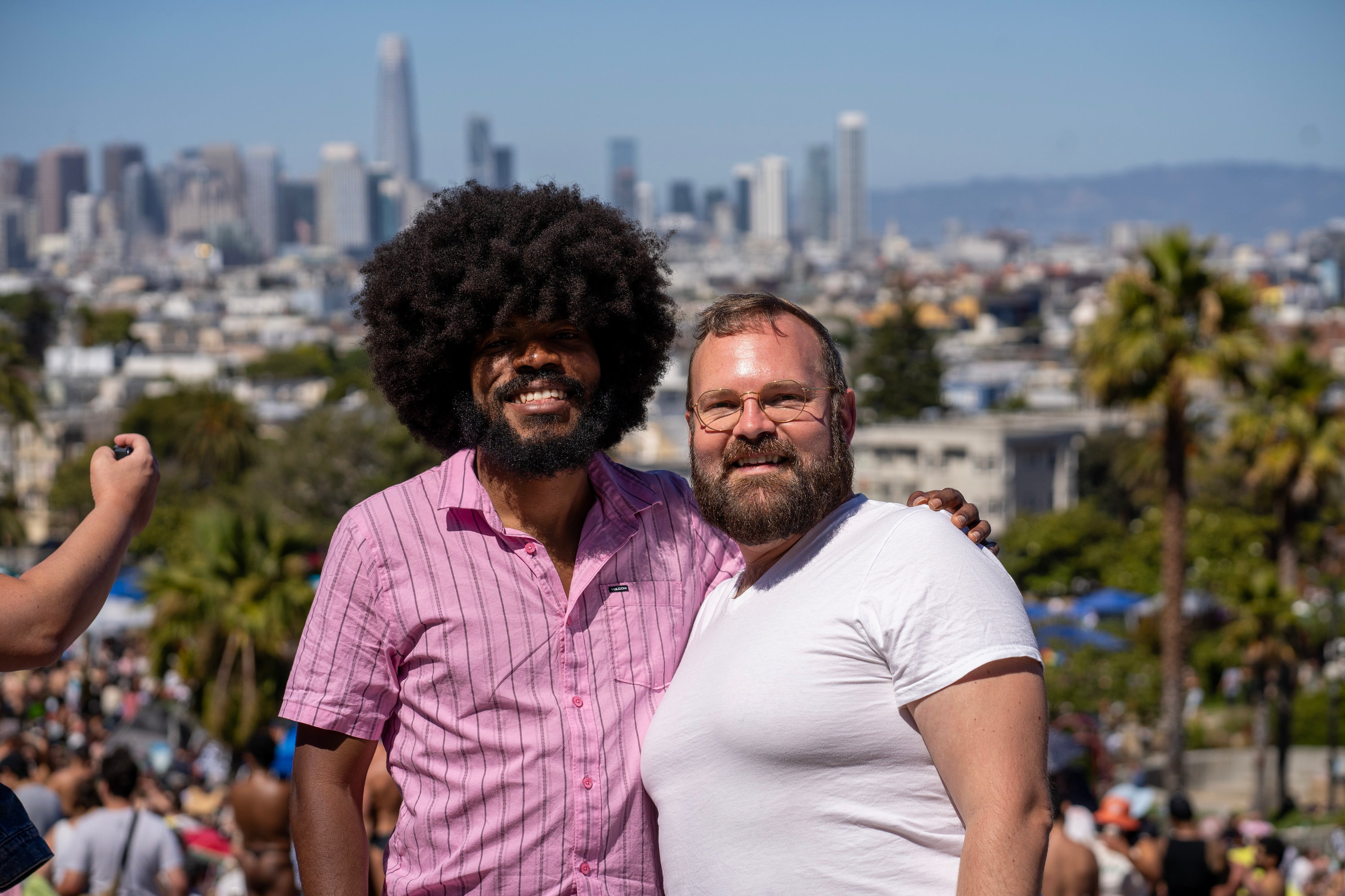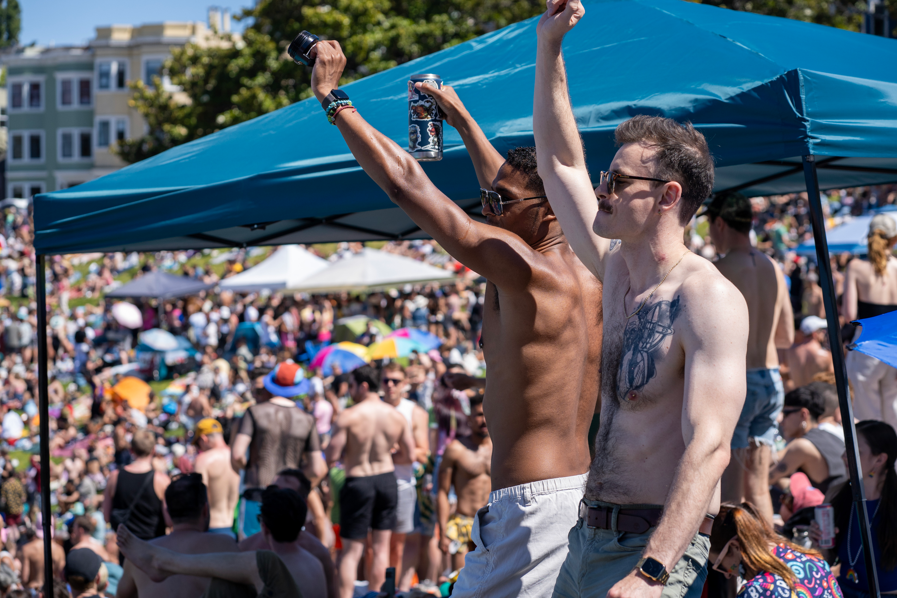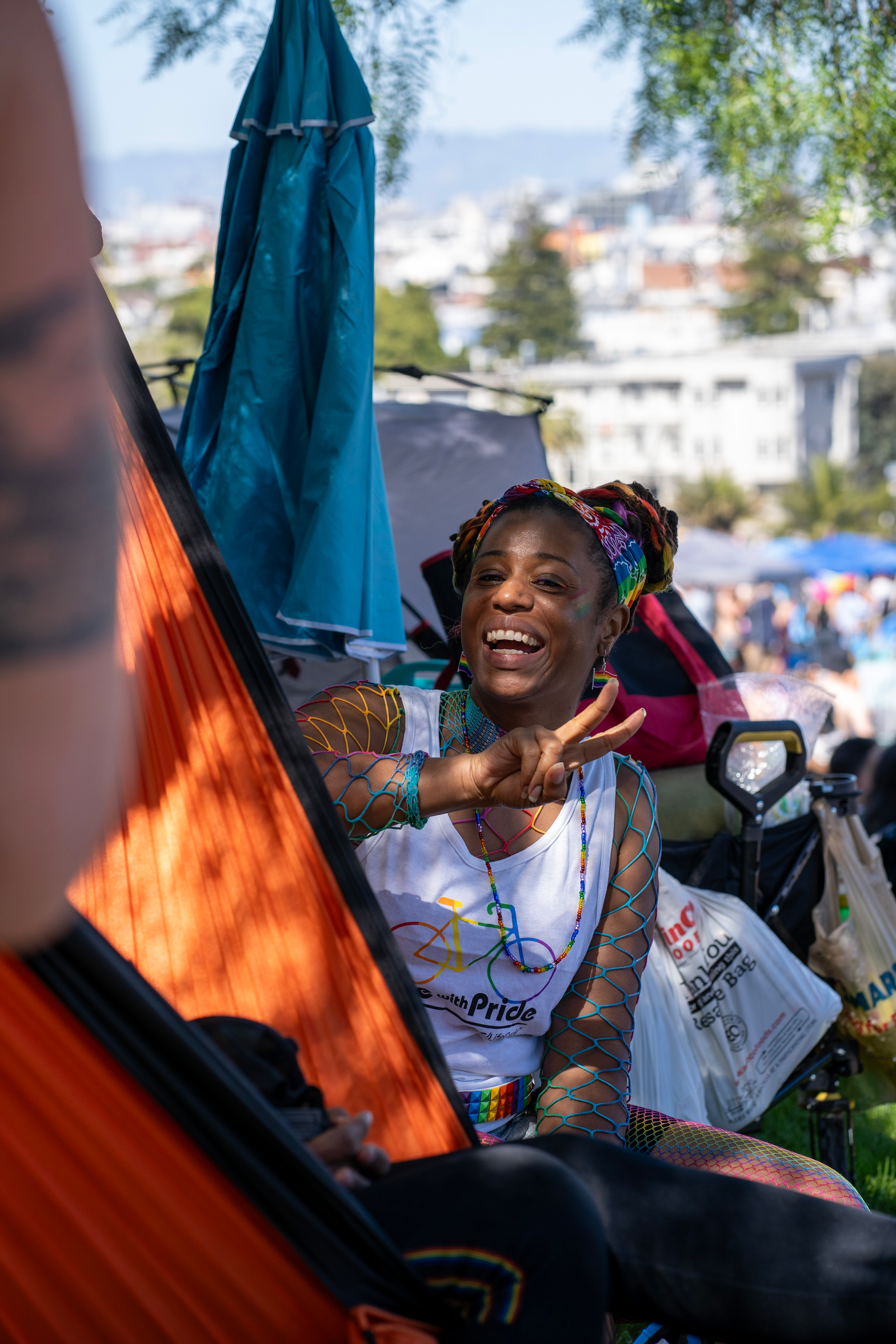They told us, “We always come for Dolores but are usually too hungover for the parade. We’ve walked the parade a bunch of times, so we don’t feel like we need to do it anymore. But when we do the parade we go to see the dykes on bikes and then we usually leave after. But today (the park) is what Pride is about, and why we come from all the way Oakland every year.”