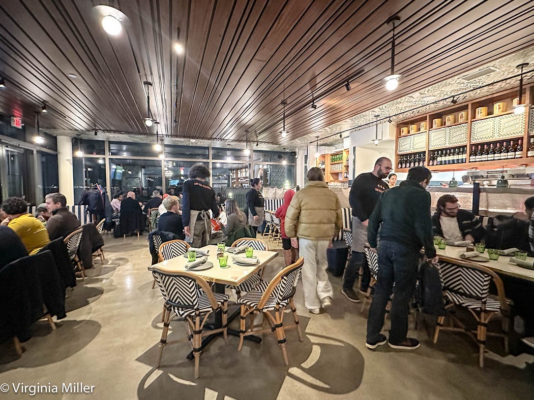 Designer Jon de la Cruz of DLC-ID goes with coastal Italian influences and a massive outdoor bar area that can be fully open air or zipped up with window-lined covering when it’s chilly. Large screen TVs are always a pet peeve for me outside of sports bars, but with direct ties to the sporting events going on a few feet away, TVs are forgivable. Given weekday lunch hours and game day early hours on weekends, the pizzeria is easily about that view. With expansive spaces to eat outdoors around Thrive City, a walk-up window serves slices and gelato to-go but dining-in is the way to take in the view with drinks.