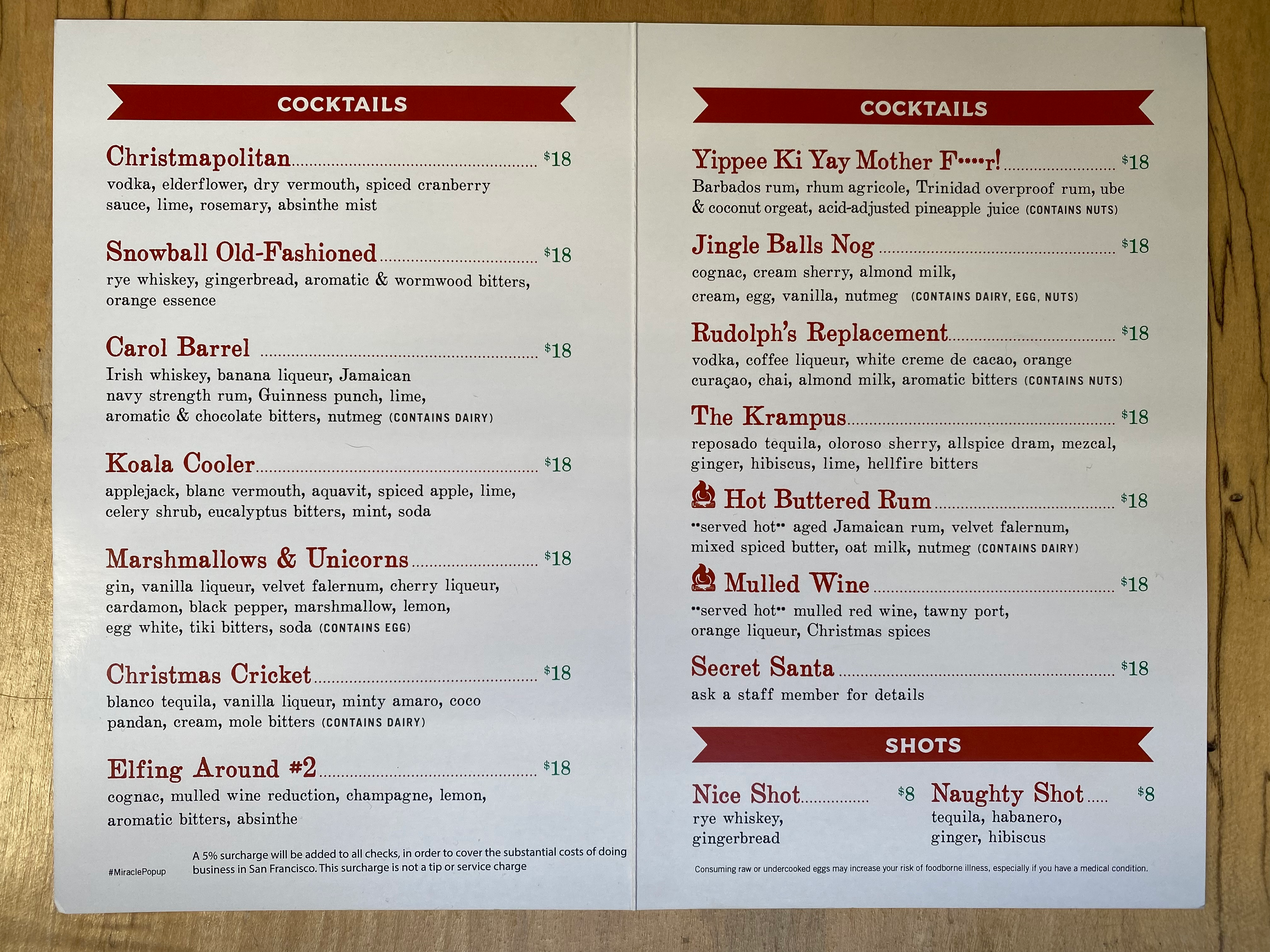 Miracles are popping up all from Yukon to Panama, London to San Francisco, with a couple dozen sprinkled in between. Ours is an easy walk from the Union Square skating rink — still $20 for an hour and skates — and there’s no reason not to hobble on over afterwards to recover your inner child with one or several of the sixteen holiday cocktails. I took the in-laws, visiting for Thanksgiving, to opening night and we tried six for you.