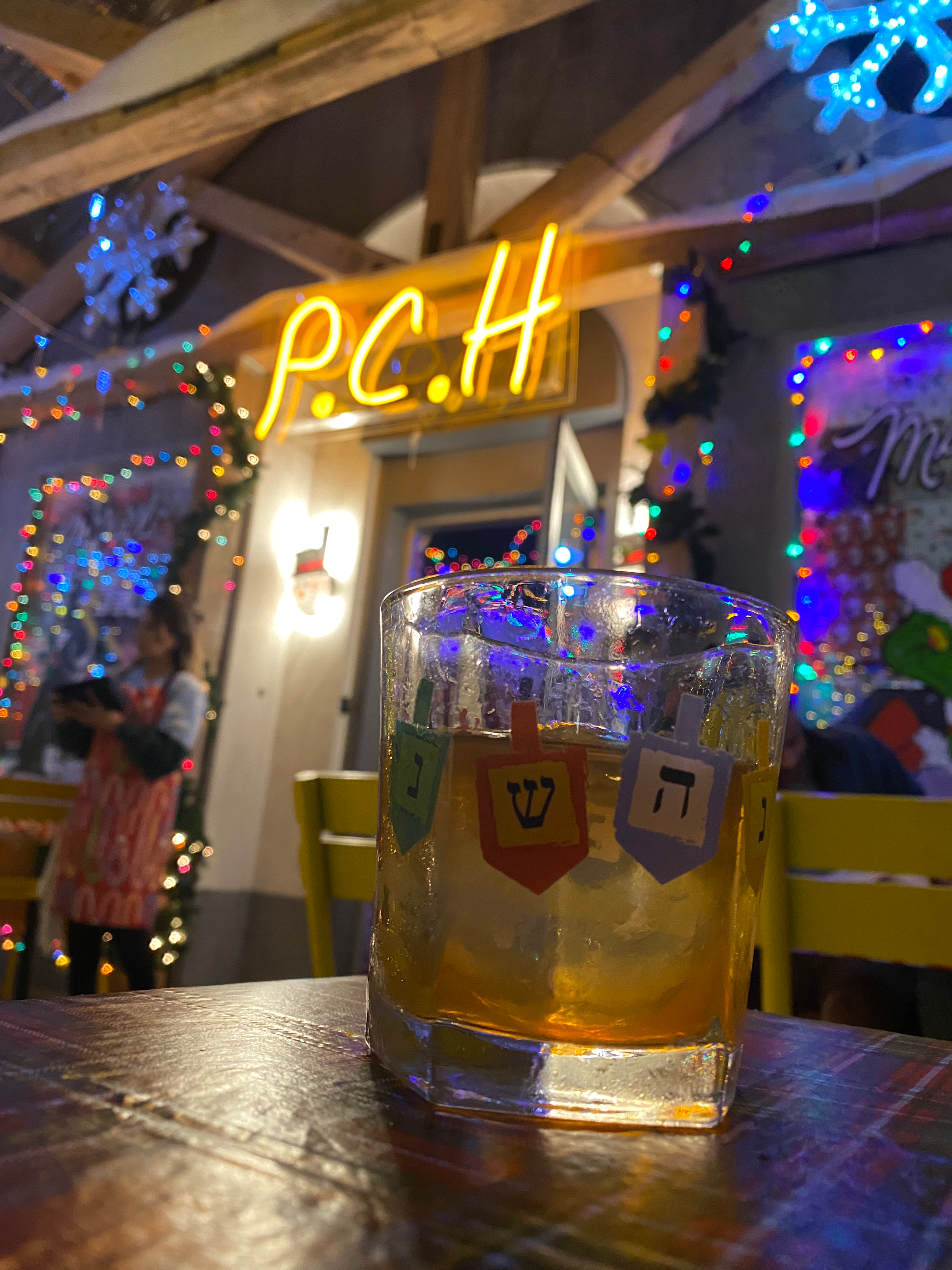 Start off with the Snowball Old-fashioned, on the top right: a pleasant tipple ending in gingerbread notes. The wormwood bitters will remind you a bit of a sazerac, effectively an old fashioned with an absinthe wash. Served on an ice sphere in a dreidel lowball glass. Next up: