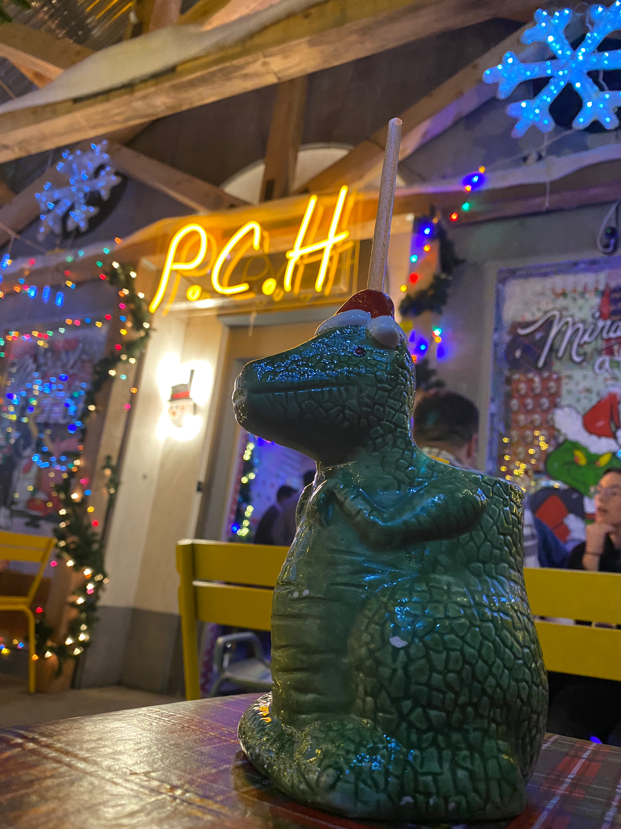 A nutty white russian served in crushed ice in a ceramic t-rex. Almond milk lends a lot of flavor here, especially as the crushed ice begins to water down the vodka and coffee liqueur for a pleasant adult Yoo-hoo.