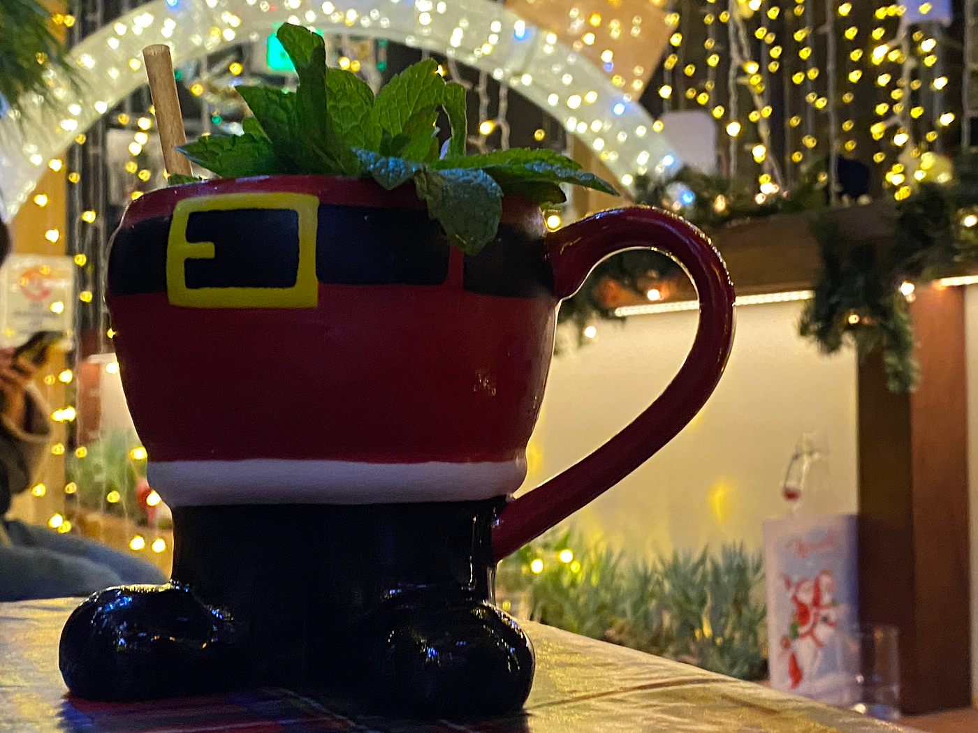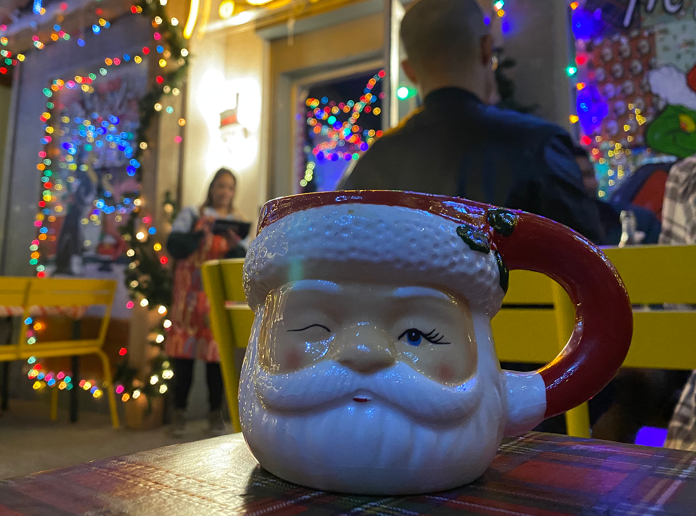 Die Hard diehards will rejoice at this chance to assert themselves. It’s a rummy reminder of a pina colada on crushed ice, but the coconut orgeat goes down more lightly than cream alongside pleasantly sweet pineapple juice. Served in a topless St. Nick mug. No, not like that.