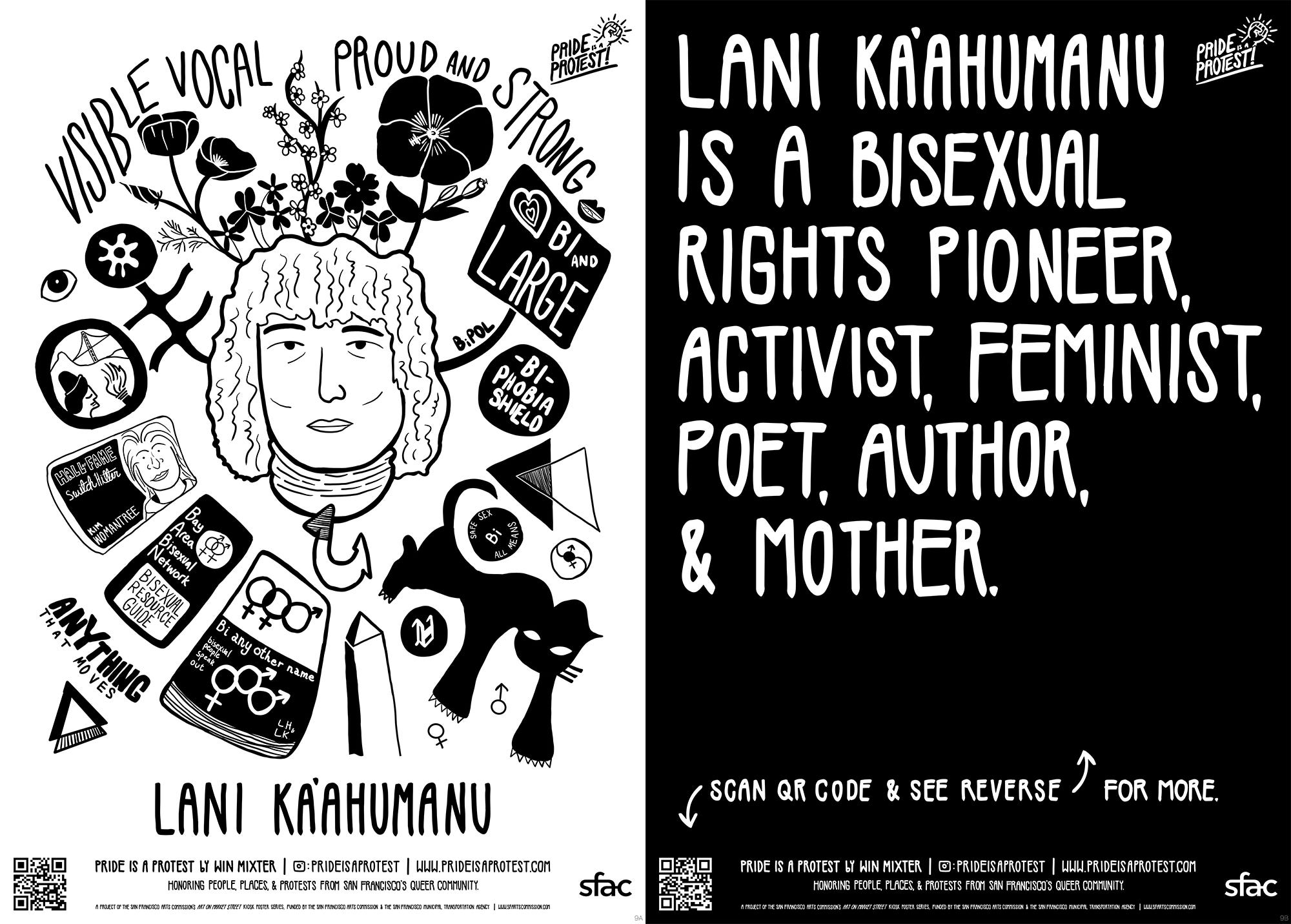 Lani Ka’ahumanu (b. 1943) is a bisexual rights activist, poet, author, and mother. She is considered one of the foremothers of the bisexual rights movement, which began in earnest in the 1980s. She originally came out as a lesbian and moved to San Francisco in 1974, leaving her two children in the care of her ex-husband. Ka’ahumanu later came out a second time as bisexual after falling in love with a man who also identified as bisexual. She helped found the San Francisco State University Women and Gender Studies Department.