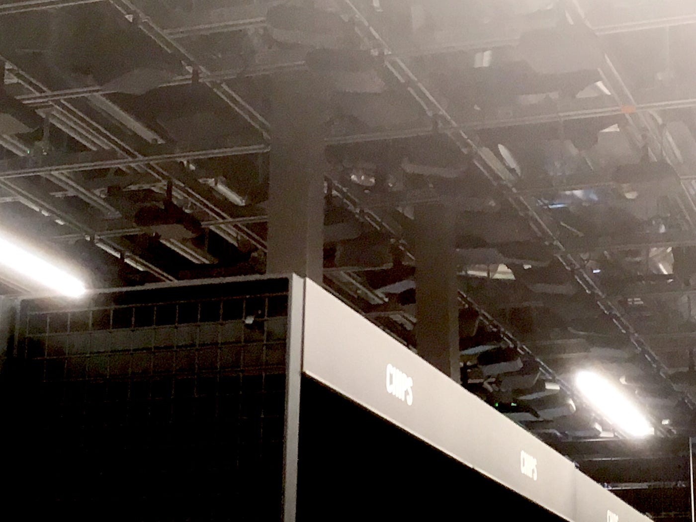 If you look up at the ceiling, you will see more cameras than you have ever seen in your entire life. It’s not like 10 or 20 security cameras; it’s more like several hundred. My smartphone camera fought against the fluorescent light to capture them well, but you can sort of see them in this image — every one of those square boxes in the ceiling lattice is some kind of camera and sensor rig.