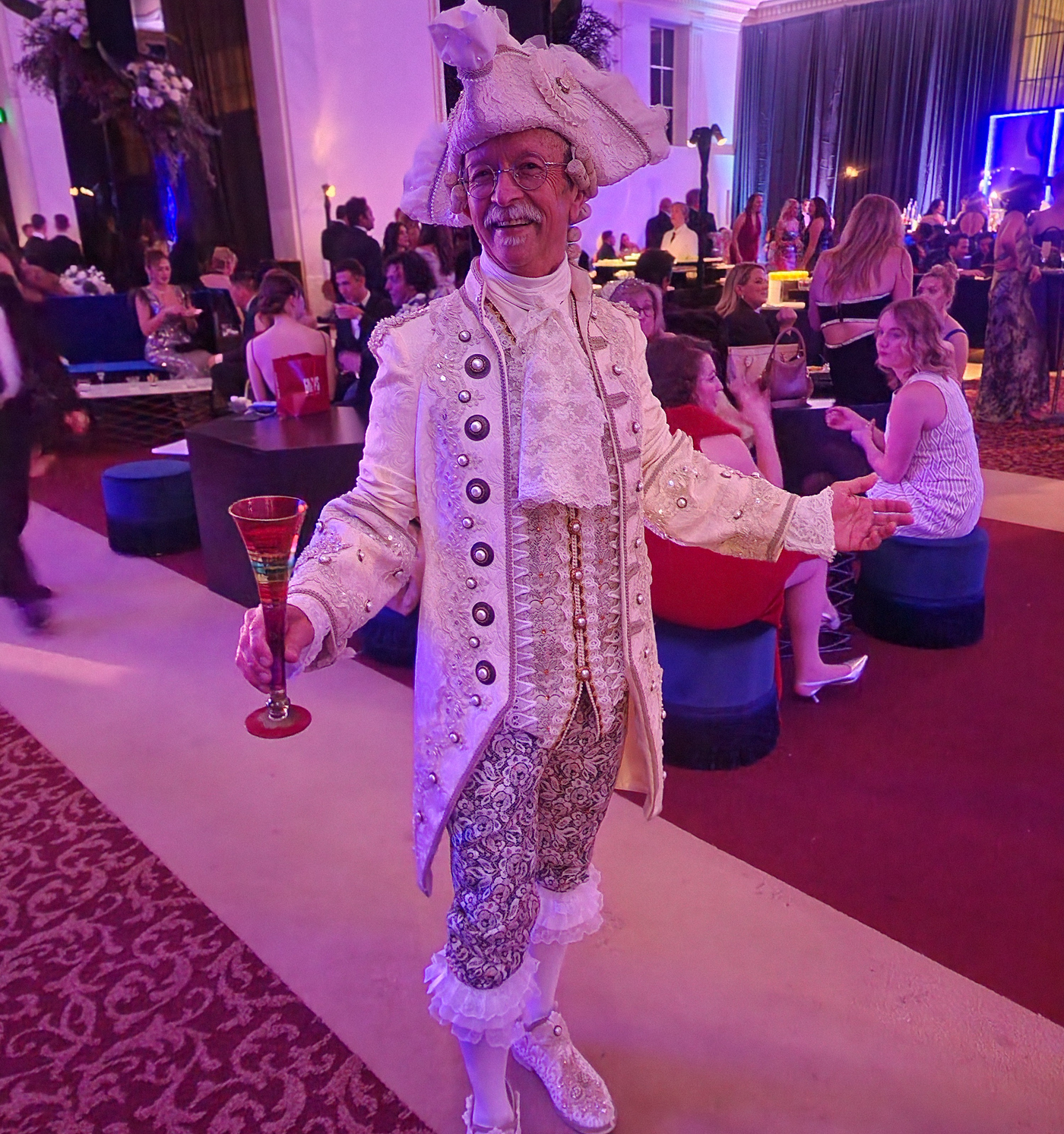 A pre-show dinner allowed young patrons to mingle with high rollers, providing a casual social atmosphere with heavy bites, cushy chairs, and an open bar. I immediately spotted costume designer David Reardon making his rounds while holding a tall cocktail glass he brought from home, like we’d gone to Vegas. I mean that in the most entertaining way, David, and I wish I had such moxy.