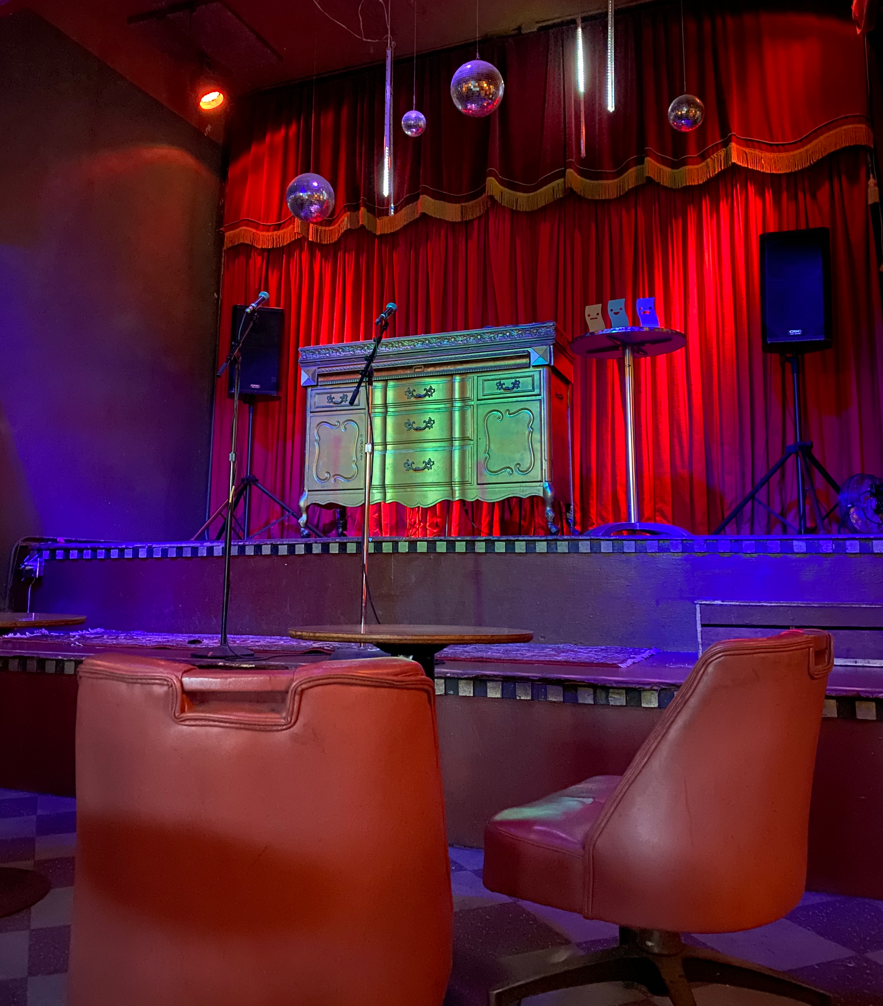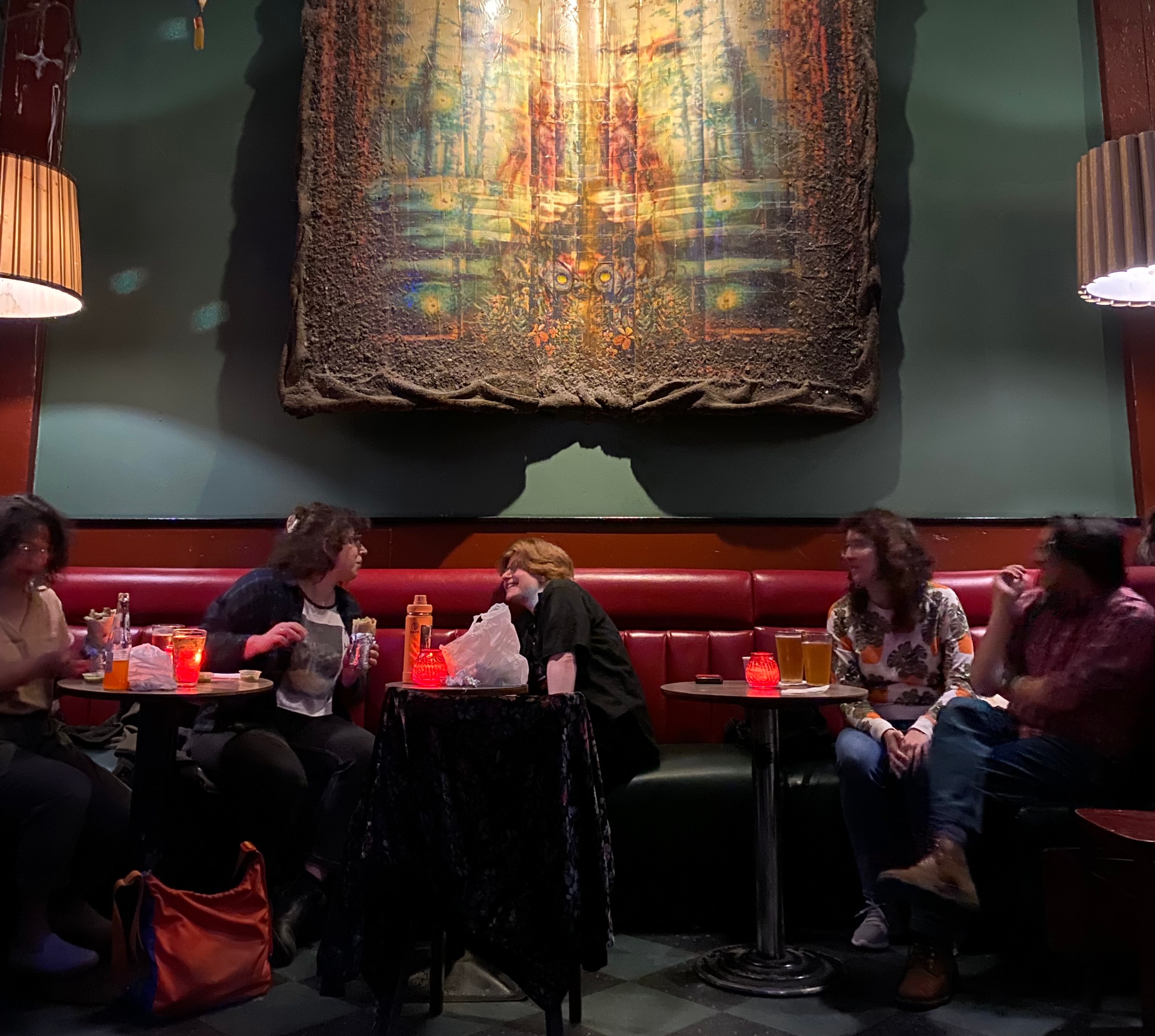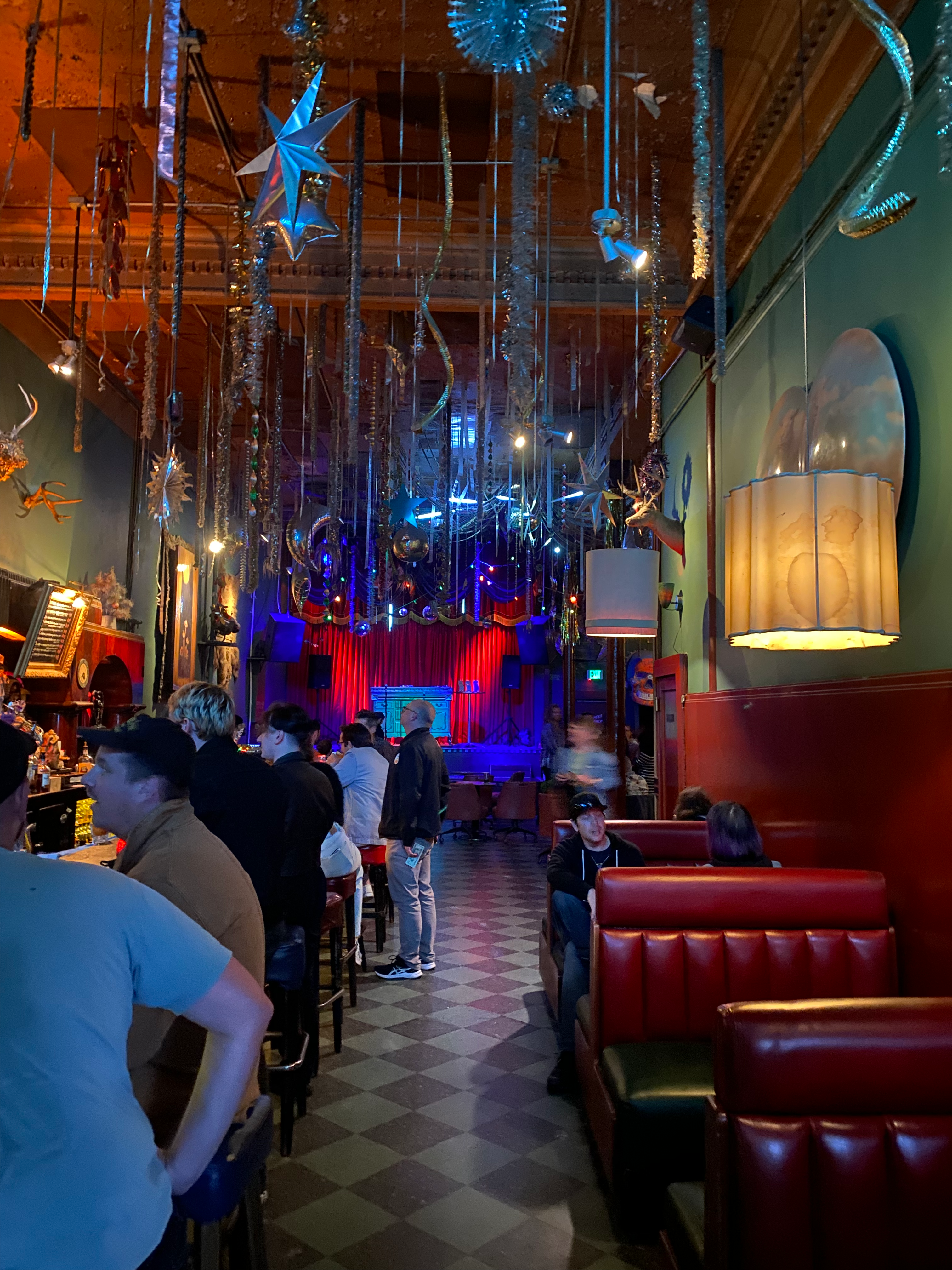 The hep Makeout Room welcomes you with a long, wooden bartop gummy with booze, stretching into a moody, gin- and PBR-scented room. On the left: a soundboard propped up on a keg; overhead, slowly dancing disco lights coruscating overhead around dusty metallic stringers and stars.