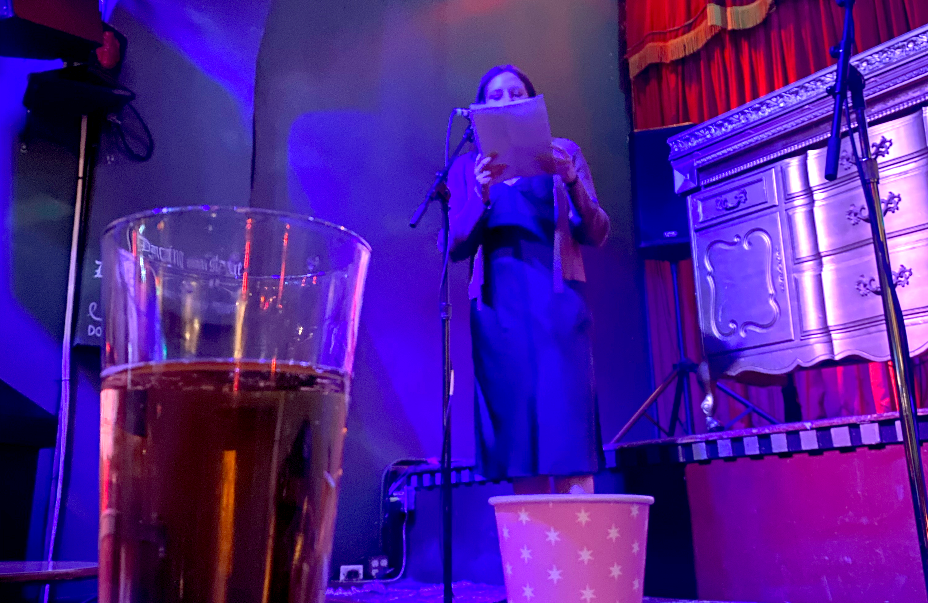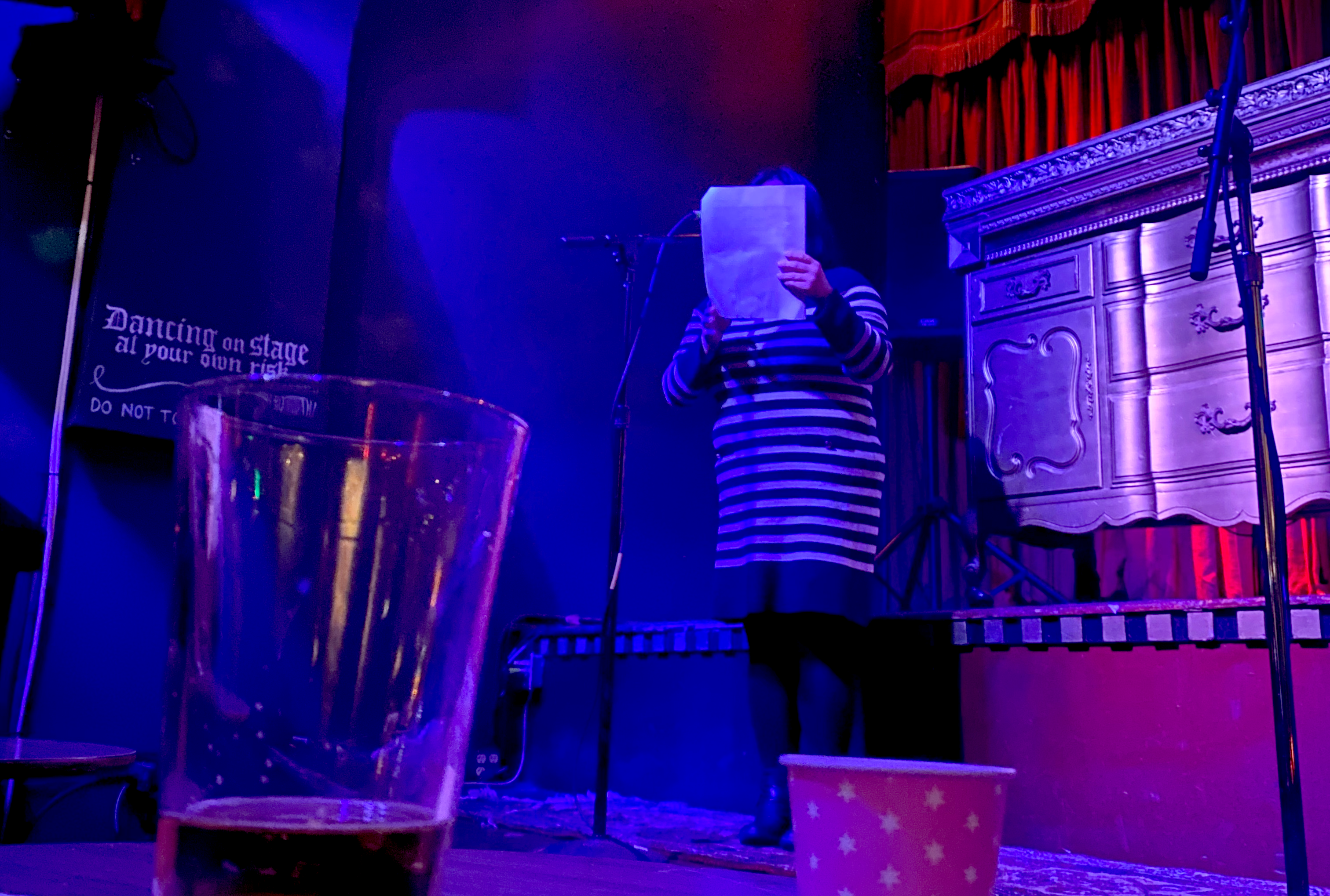 With that catharsis, the evening was over. Judges gathered and dispensed awards: Shlichte was the judge’s favorite, with Christine Ortega as runner-up. It was one of those evenings where it seemed like everyone won, and not in a cheap way; Joe Wadlington later told me that the show was able to pay each writer $118. Each story at least glanced at the topic, sometimes spearing it through verbatim but all of them serving some measure of reluctant apology, acknowledgement of an external truth.