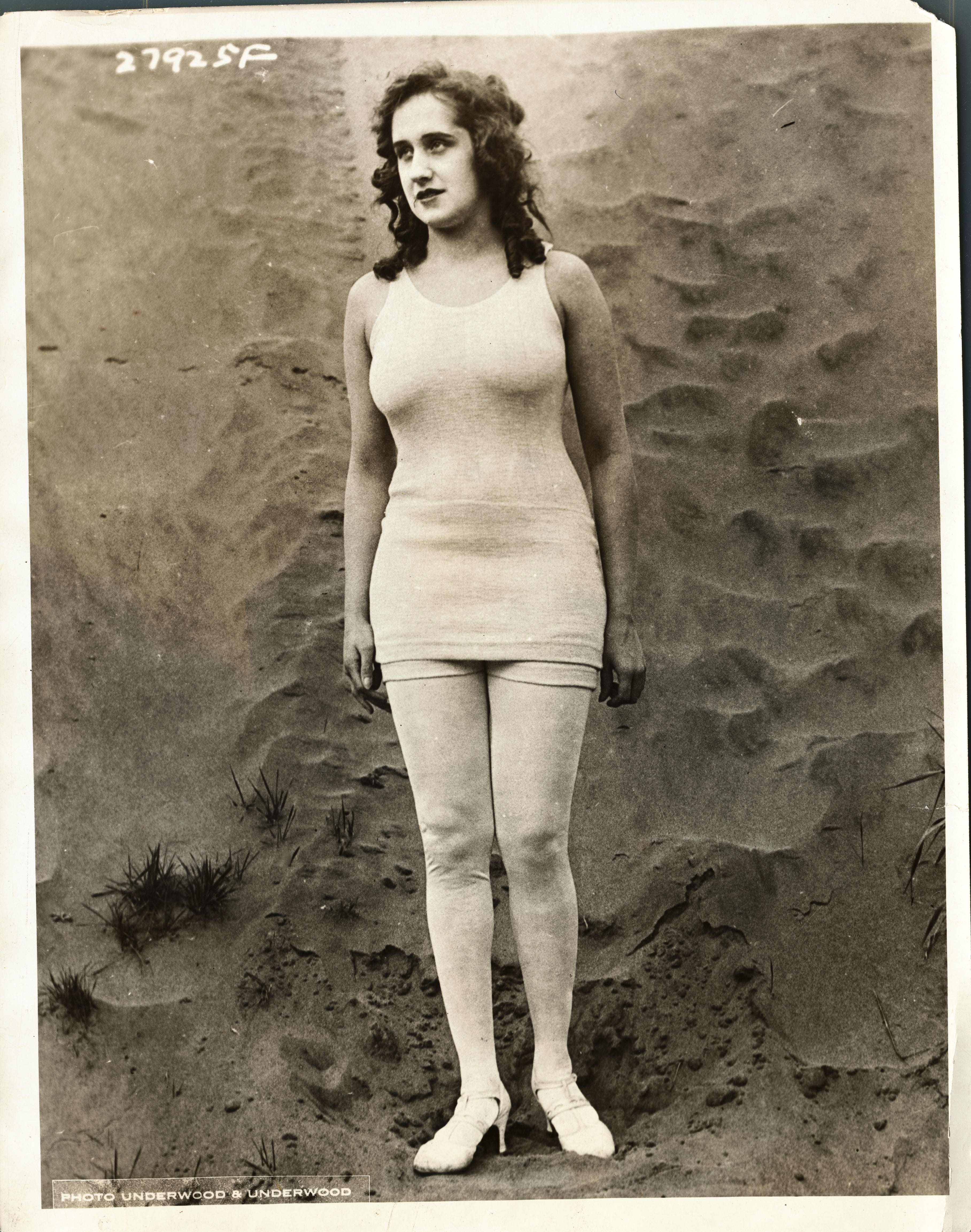 Although the fashions of the ’20s were much more comfortable than what came before them, they were hardly revealing — especially at the beach, and especially for women and girls. Swimsuits still usually covered most of women’s bodies — and if they didn’t, they could be arrested (not a joke — see photo below.)