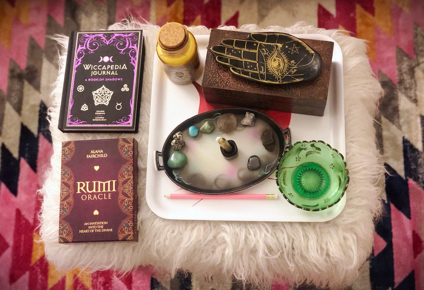 She recommended some things to kick-start my spiritual-protection altar. Witchcraft is about symbolism. Objects represent feelings and desires. You put your energy into them to create a sense of overall control. I went home and created an altar with some objects and personal-inspiration tokens.