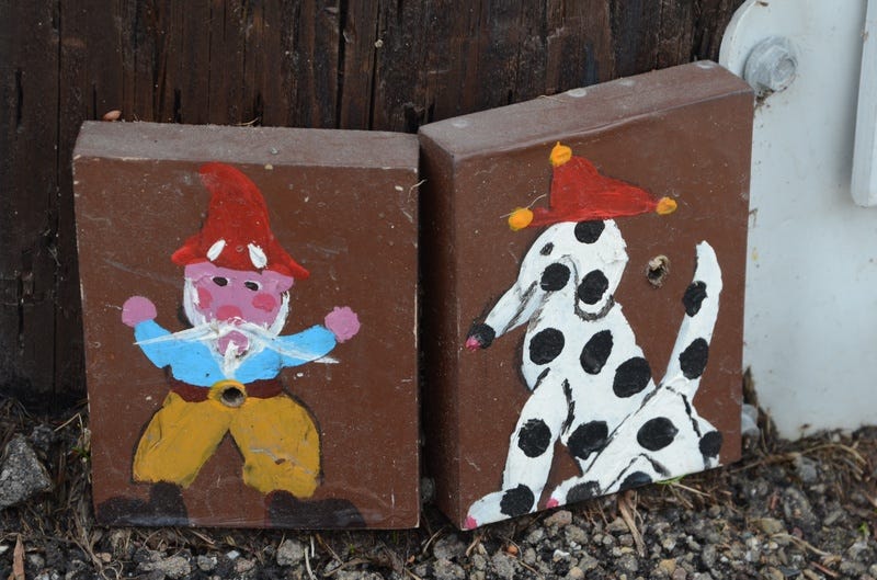 Pacific Gas & Electric vowed to remove the installations until a public outcry caused them to leave the little guys alone. The work itself isn’t exactly masterful, but there’s something irresistible about the crude folk-art renderings. The rosy-cheeked elves are usually dancing a jig. Some are accompanied by mushrooms, and others have dogs. Whatever their meaning or origin may be, the gnomes brighten the day of anyone who crosses their path.