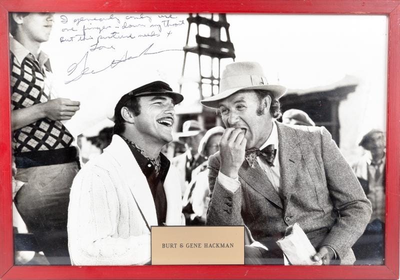 Oh man, if only Burt Reynolds could lead a ragtag group of drunks or kids or drunk kids to win back all his dope stuff … alas, the world’s premiere Bear Rug Nudist and Mustache-Haver seems to be flat broke and out of time. I honestly have no idea why Burt Reynolds is suddenly penniless, but I refuse to look it up, because it’s just too damn sad. We’ll assume some fat southern cop with a big dumb hat finally caught him, because I don’t wanna live in a world where Burt Reynolds lost his fortune for Normal People reasons. The one silver lining to all this is that we, the greedy, insatiable public, get a glimpse into some of the weird shit that our man Burt has accumulated over his decades in showbiz — and even take some of it home, thanks to this auction, which goes live Dec. 11 & 12 at the Palms in Las Vegas. Here, for you, are the craziest things you can buy from America’s Top-Lip Champion Burt Reynolds.
